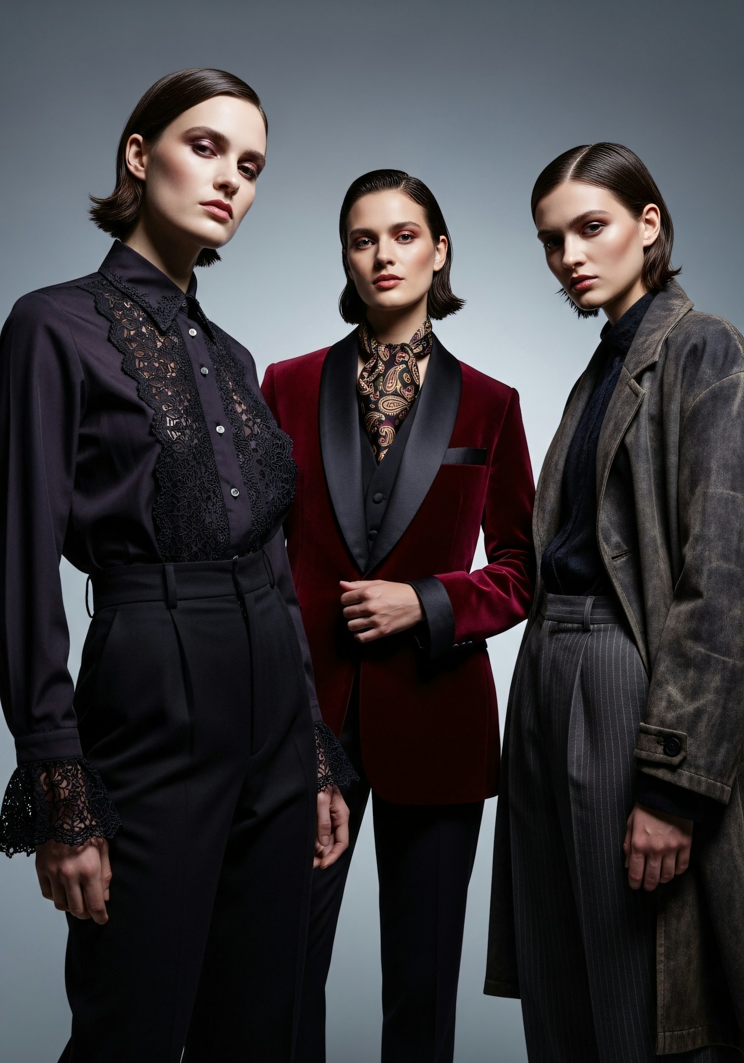 Three individuals in tailored outfits, featuring lace, velvet, and pinstripes, pose confidently in a studio setting.