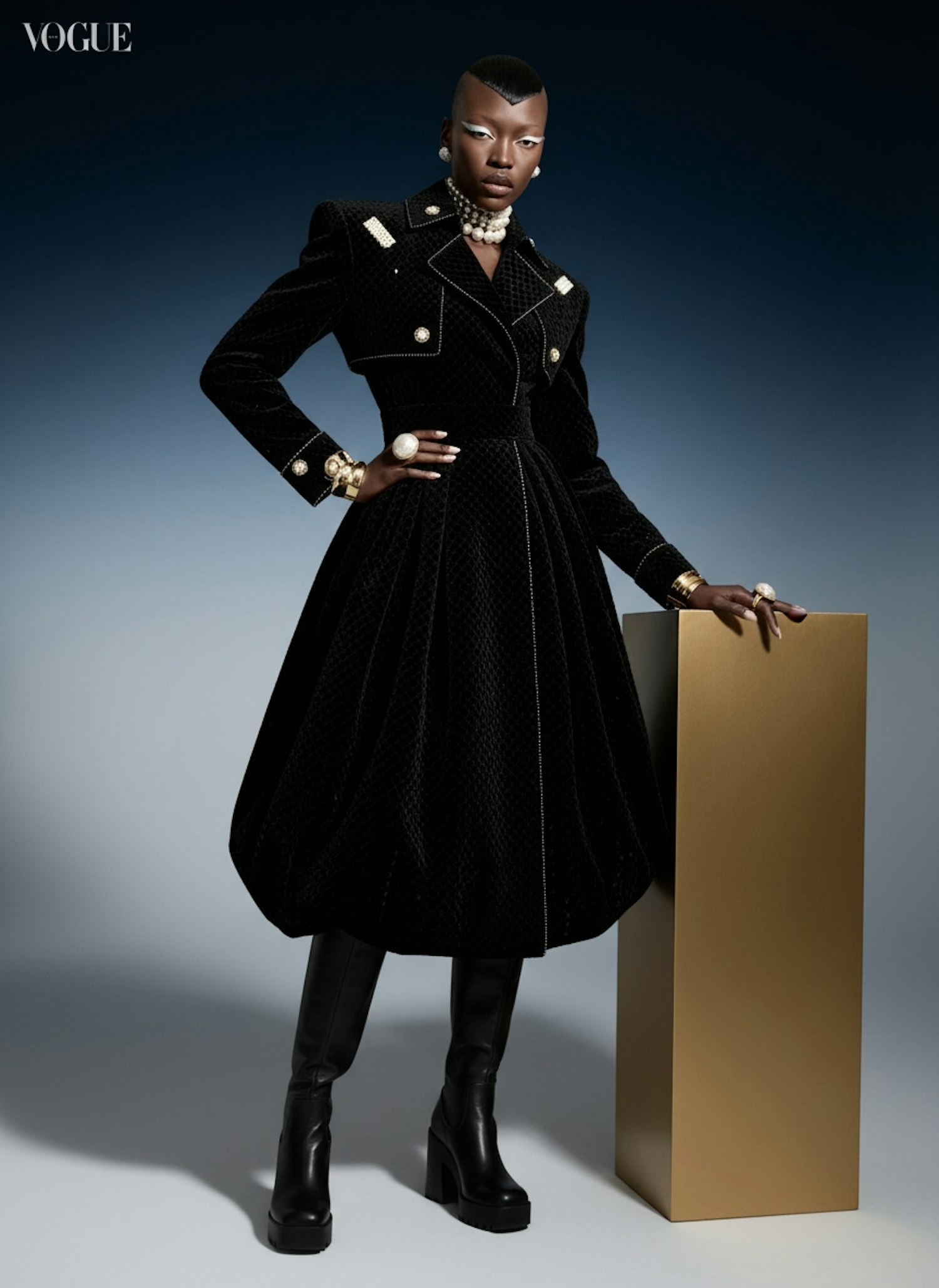 A model in a black textured coat with gold accents and pearl accessories poses against a gradient blue background with a golden pedestal.