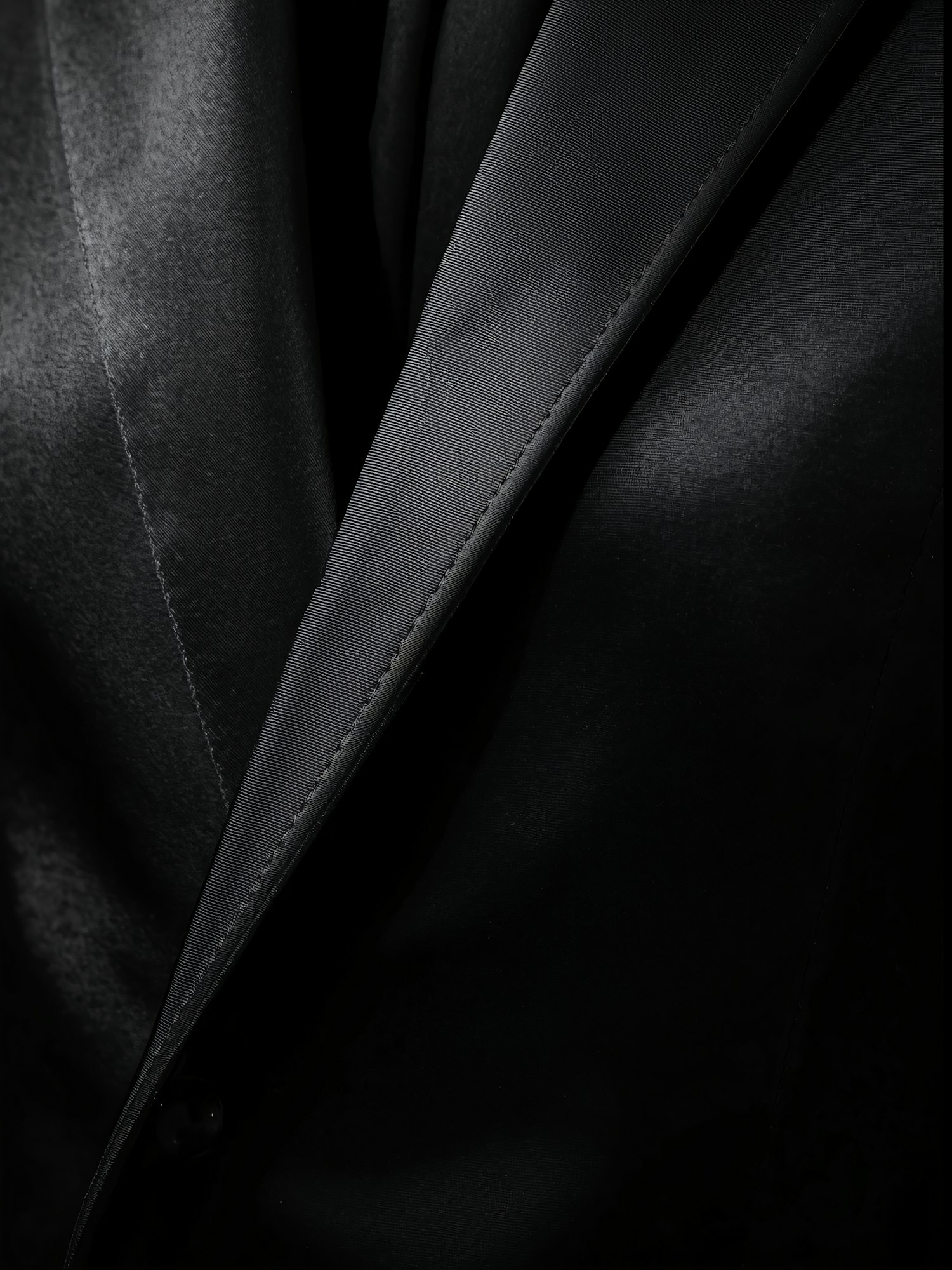 Close-up of a black suit jacket lapel, showcasing its smooth texture and fine stitching under dramatic lighting.
