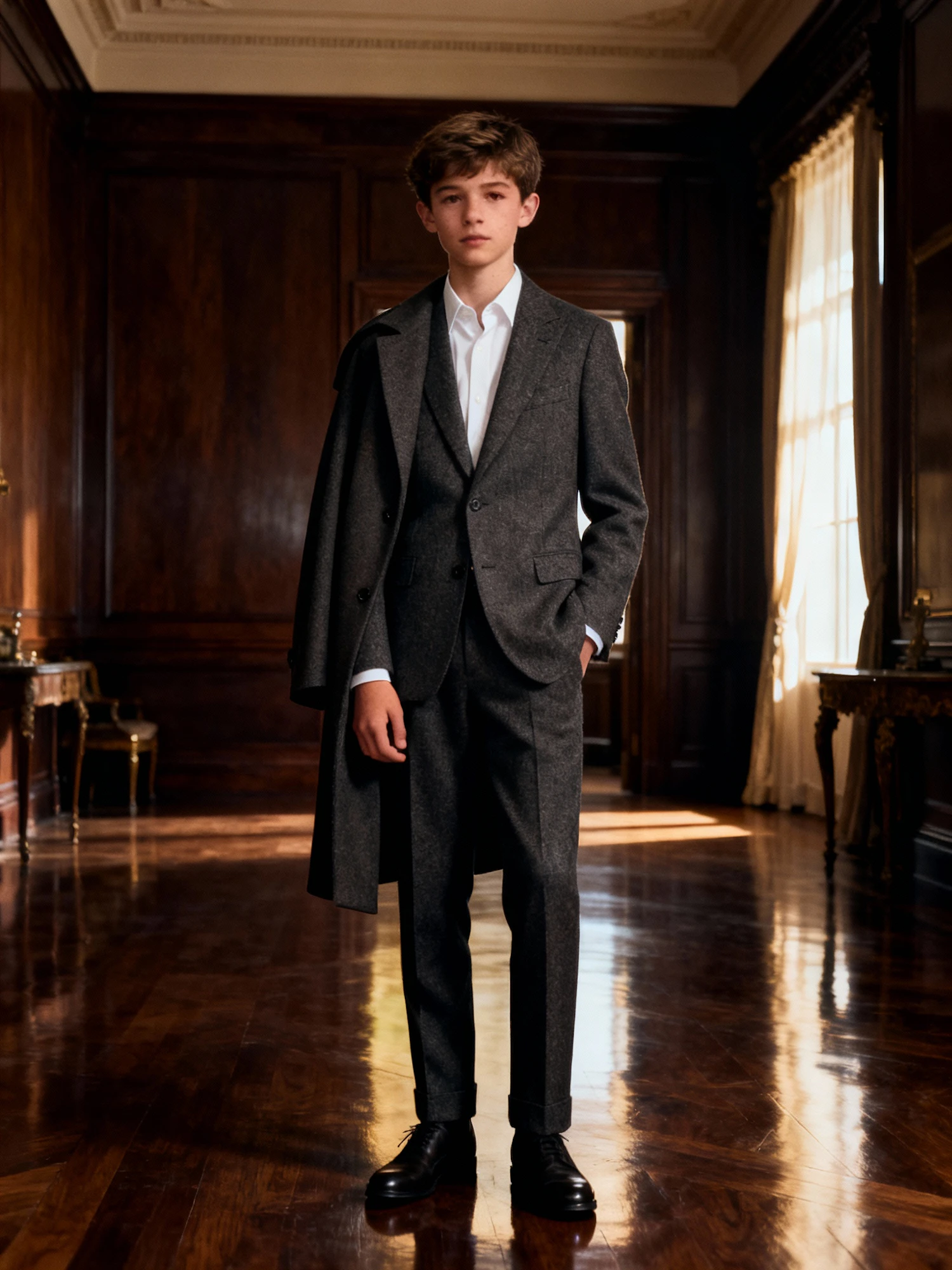 Cinematic fashion portrait of a teen model standing in a dark, refined European interior with wooden panels and soft window light. He wears a charcoal wool suit with a crisp white shirt and tailored coat draped over his shoulders. Strong pose, calm expression, slight cinematic grain. Warm brown and muted gold tones create an editorial luxury atmosphere. Inspired by Ralph Lauren Purple Label and Giorgio Armani campaign photography, 8K ultra detail.