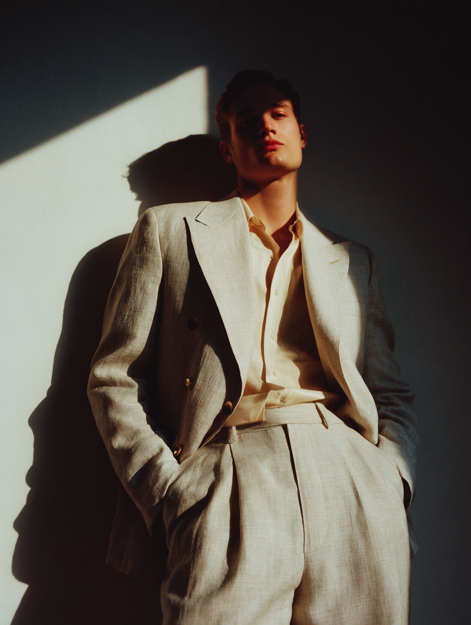 A man in a beige suit stands against a wall with dramatic lighting, showcasing classic tailoring and a sophisticated style.