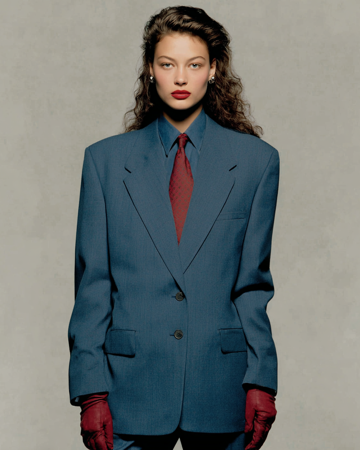 Stylish individual in a blue suit with red accents, showcasing a bold and elegant fashion statement against a neutral backdrop.