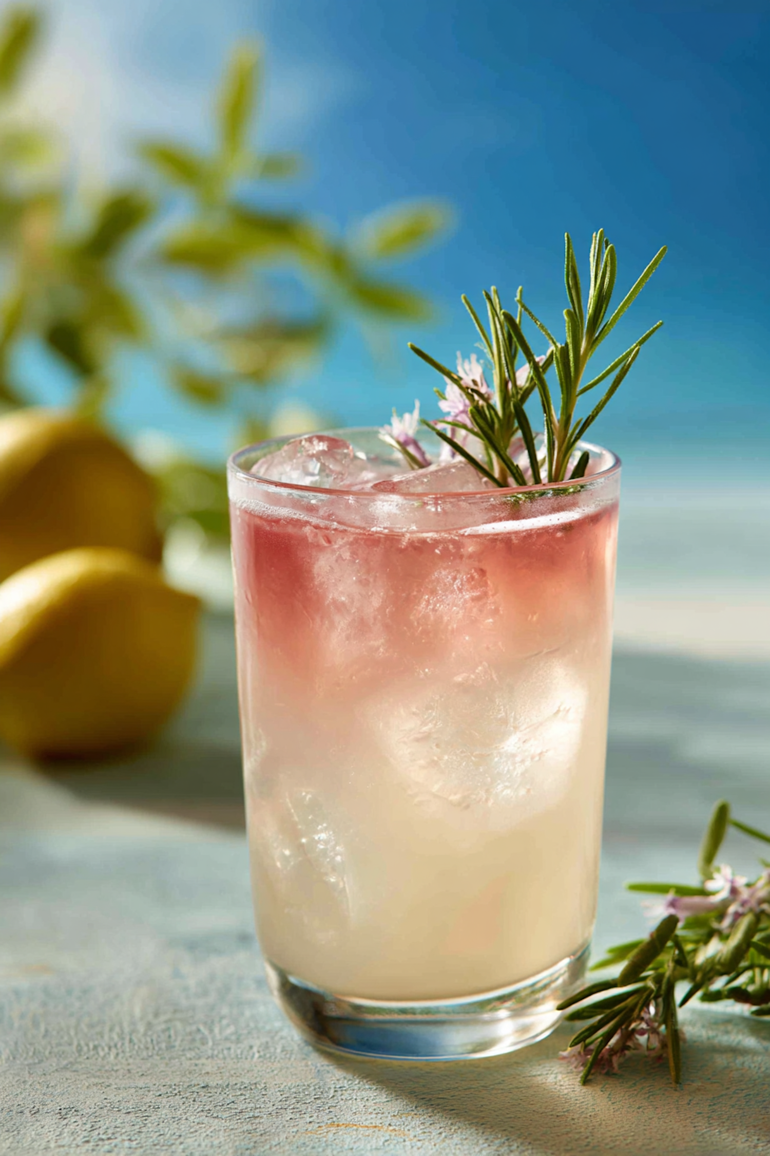 A refreshing cocktail with a rosemary garnish, served over ice with a gradient of pink and yellow hues, perfect for a summer day.