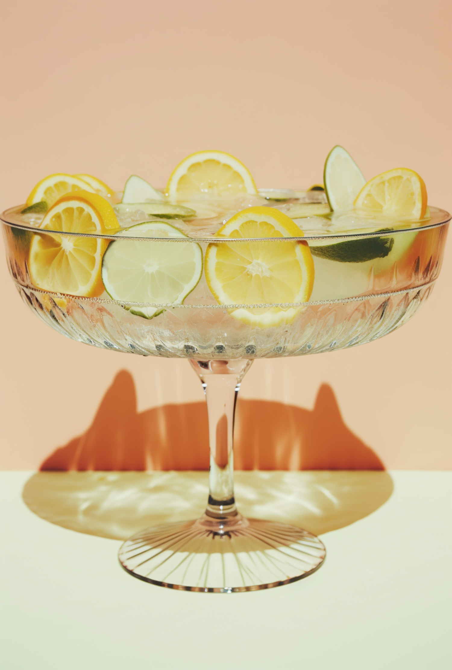 Elegant glass bowl with citrus slices and ice against a peach background, creating a refreshing and sophisticated look.
