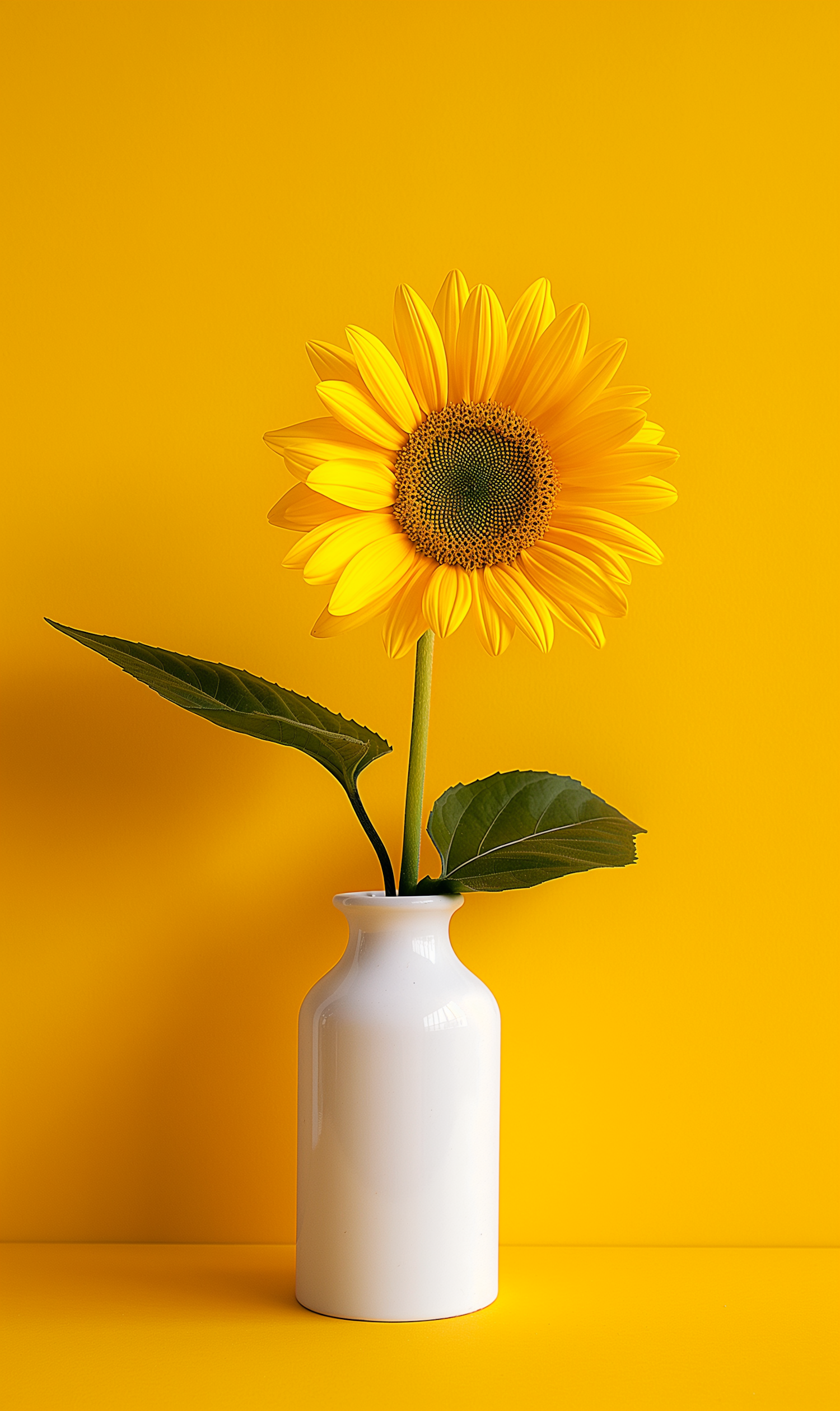 Bright sunflower in a white vase against a vivid yellow background, showcasing minimalistic beauty and vibrant colors.