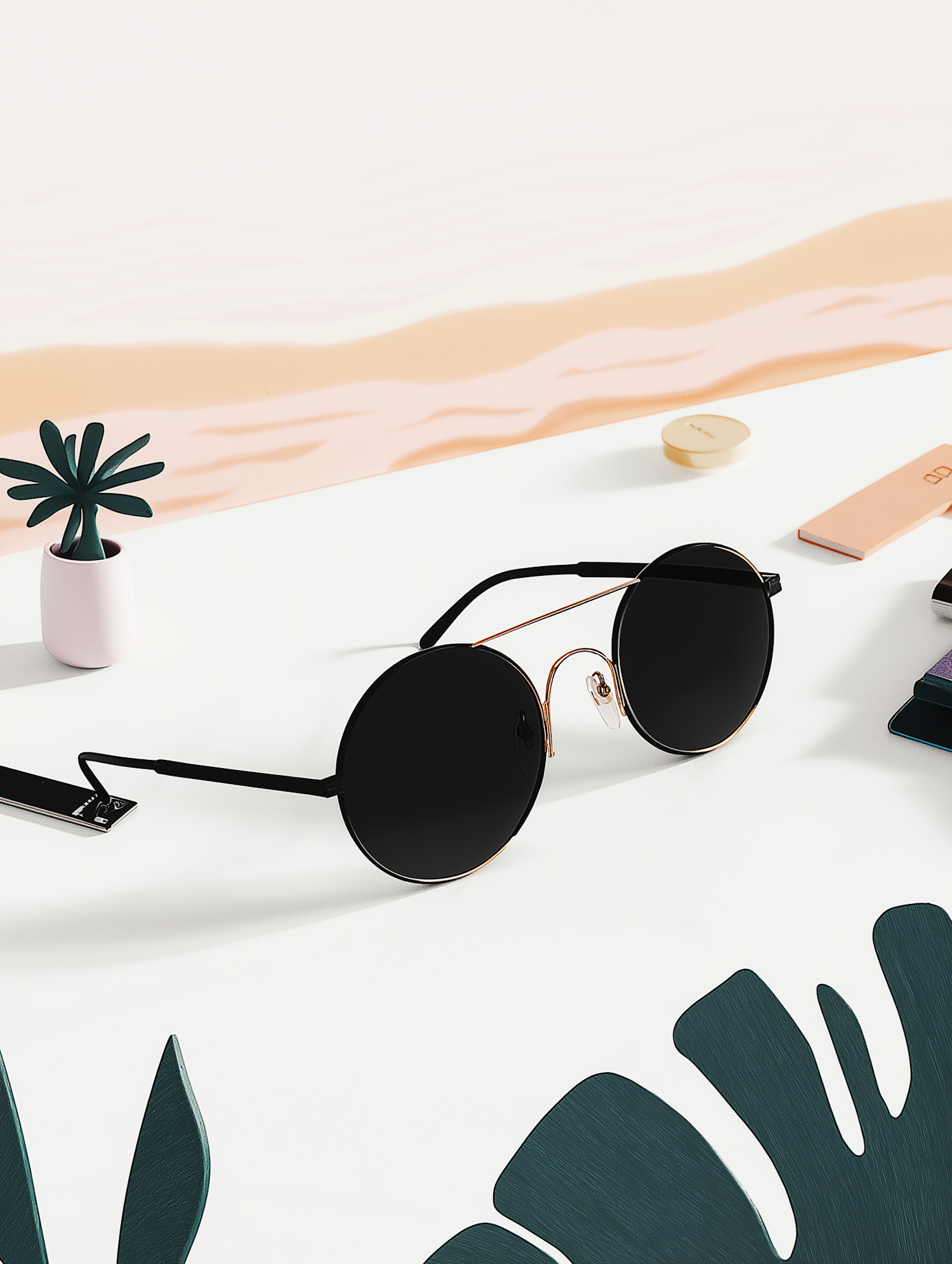 Stylish round sunglasses with black lenses on a minimalist surface, accompanied by a small plant and abstract background.