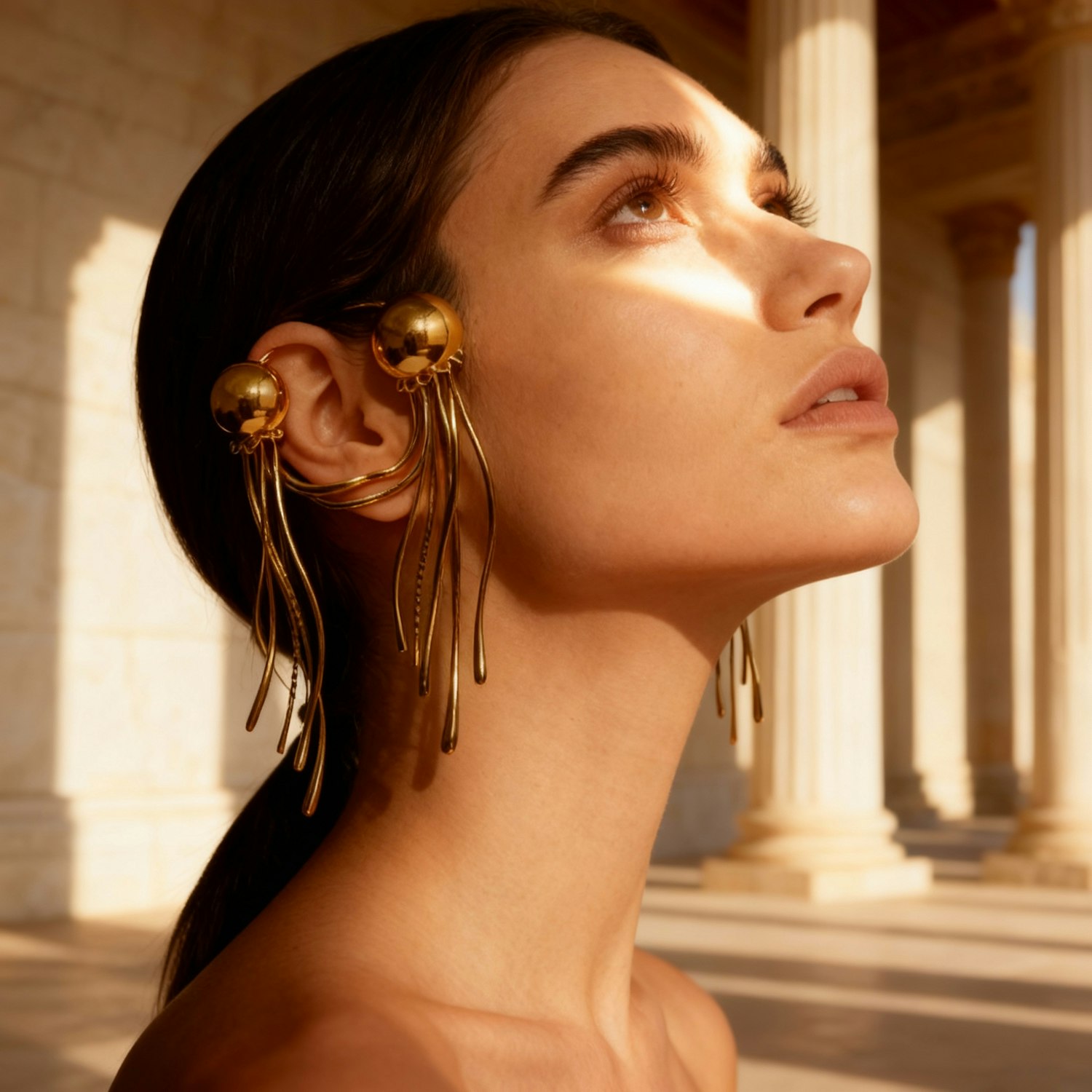 A woman wearing artistic gold earrings gazes upward in sunlight, with classical columns in the background, creating a timeless aesthetic.