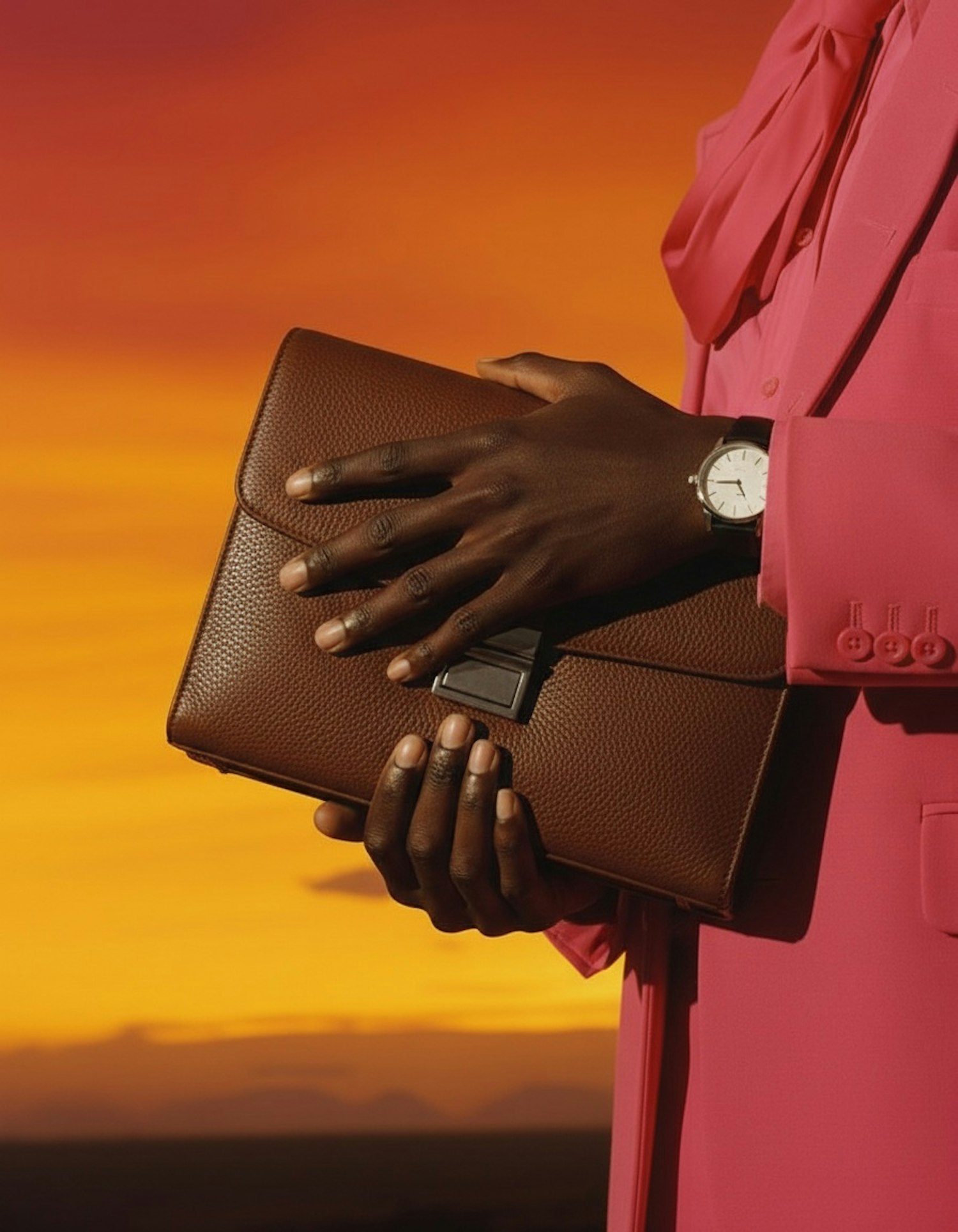 A stylish individual in a pink suit holds a brown leather clutch against a vivid sunset backdrop, showcasing elegance and contrast.