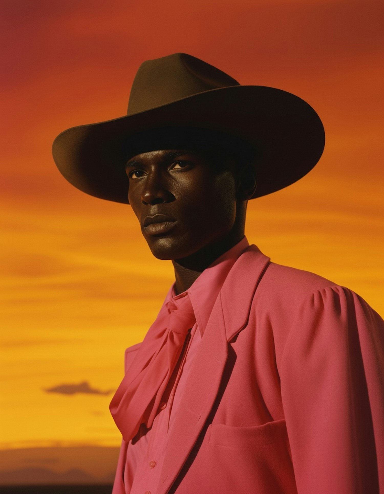 A person in a pink suit and brown hat stands against a vivid orange sunset, creating a striking and colorful portrait.