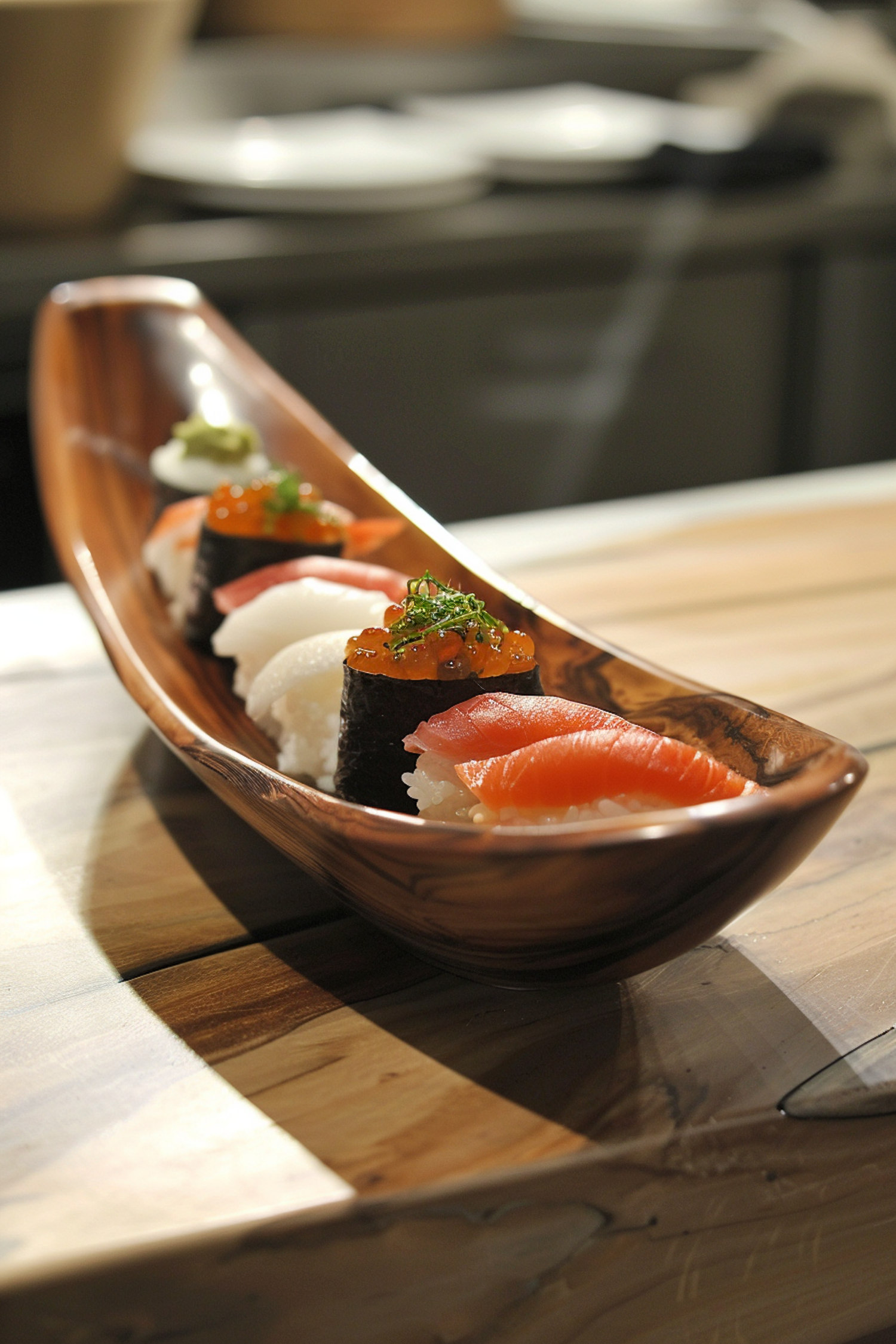 Elegant Sushi Arrangement on Serving Boat