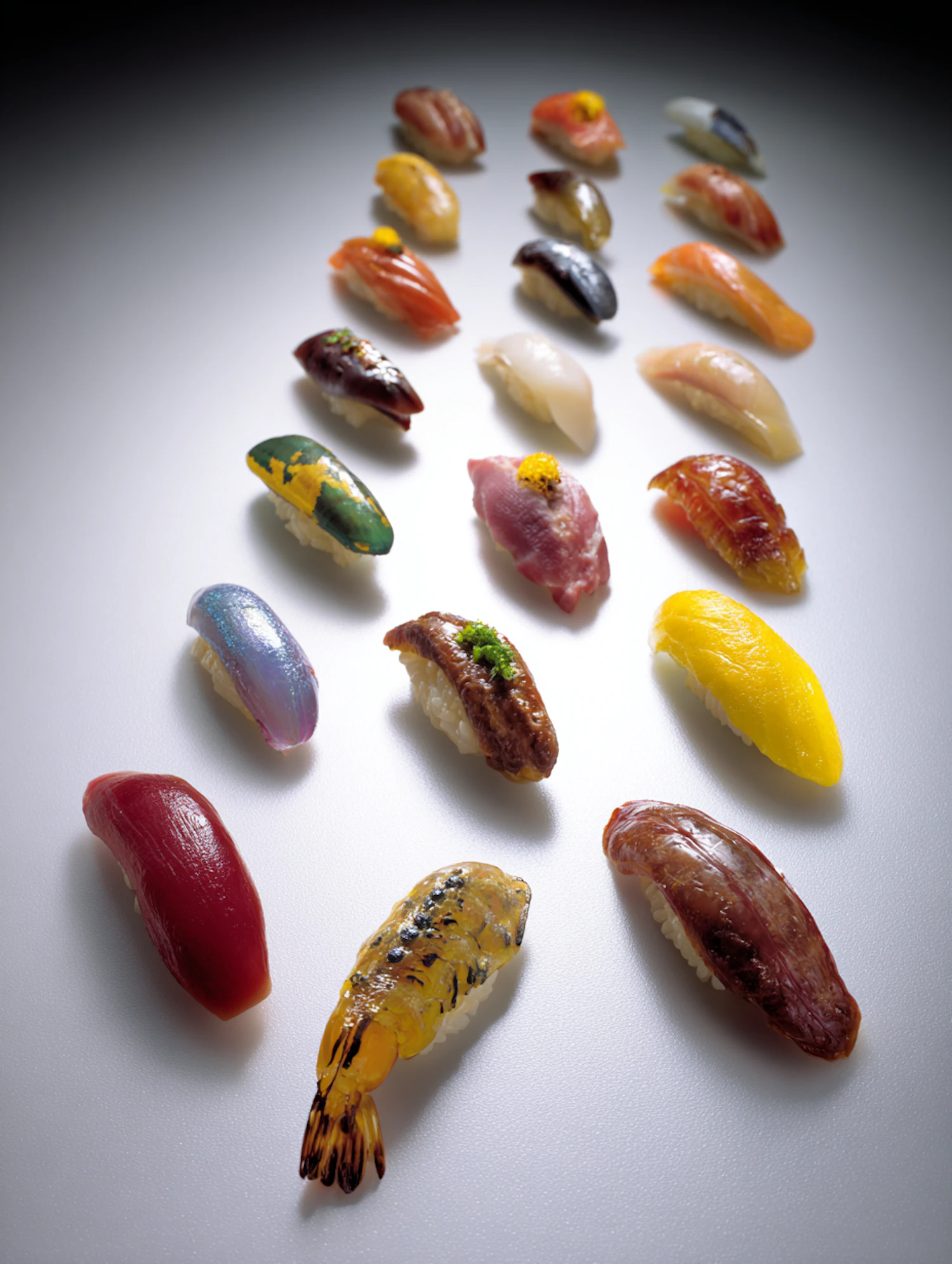 A vibrant assortment of sushi pieces arranged diagonally on a smooth surface, showcasing diverse textures and colors under soft lighting.