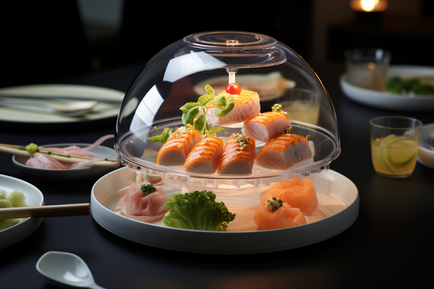 Elegant sushi platter under a glass dome with salmon nigiri, garnishes, and ambient lighting for a sophisticated dining experience.
