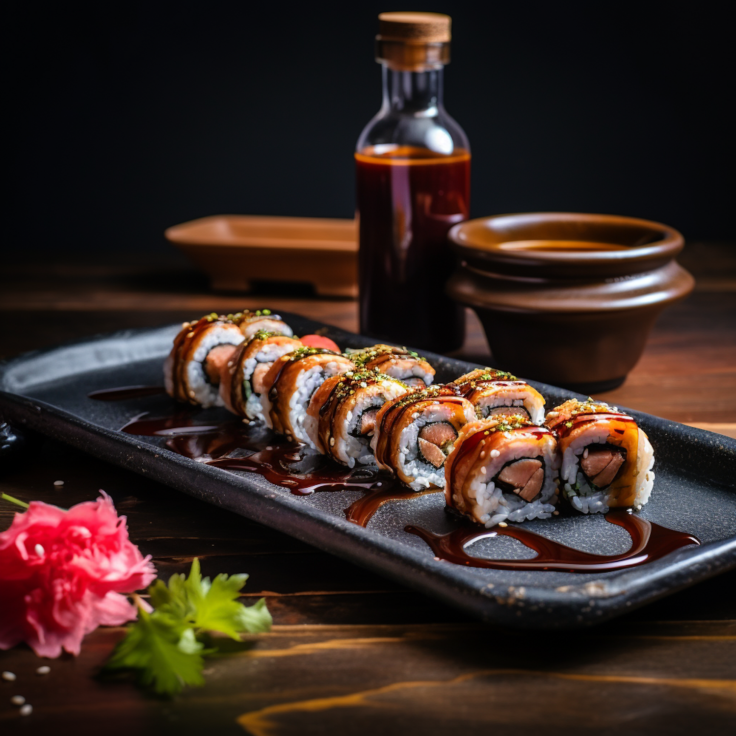 Elegant sushi platter with rolls drizzled in sauce, garnished with sesame seeds. Soy sauce bottle and flower add to the presentation.