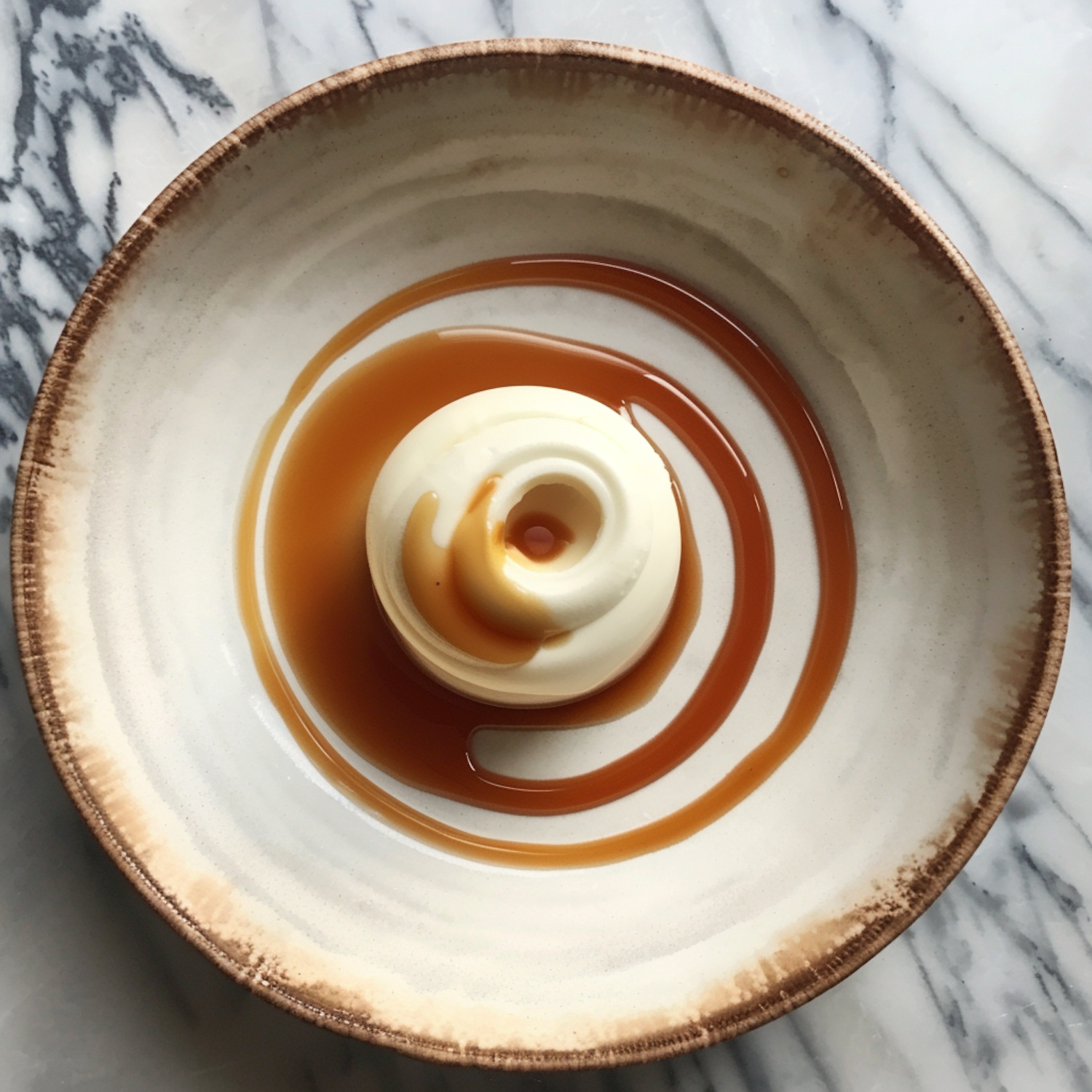 Elegant swirl of soft-serve ice cream with caramel drizzle in a rustic bowl on marble.