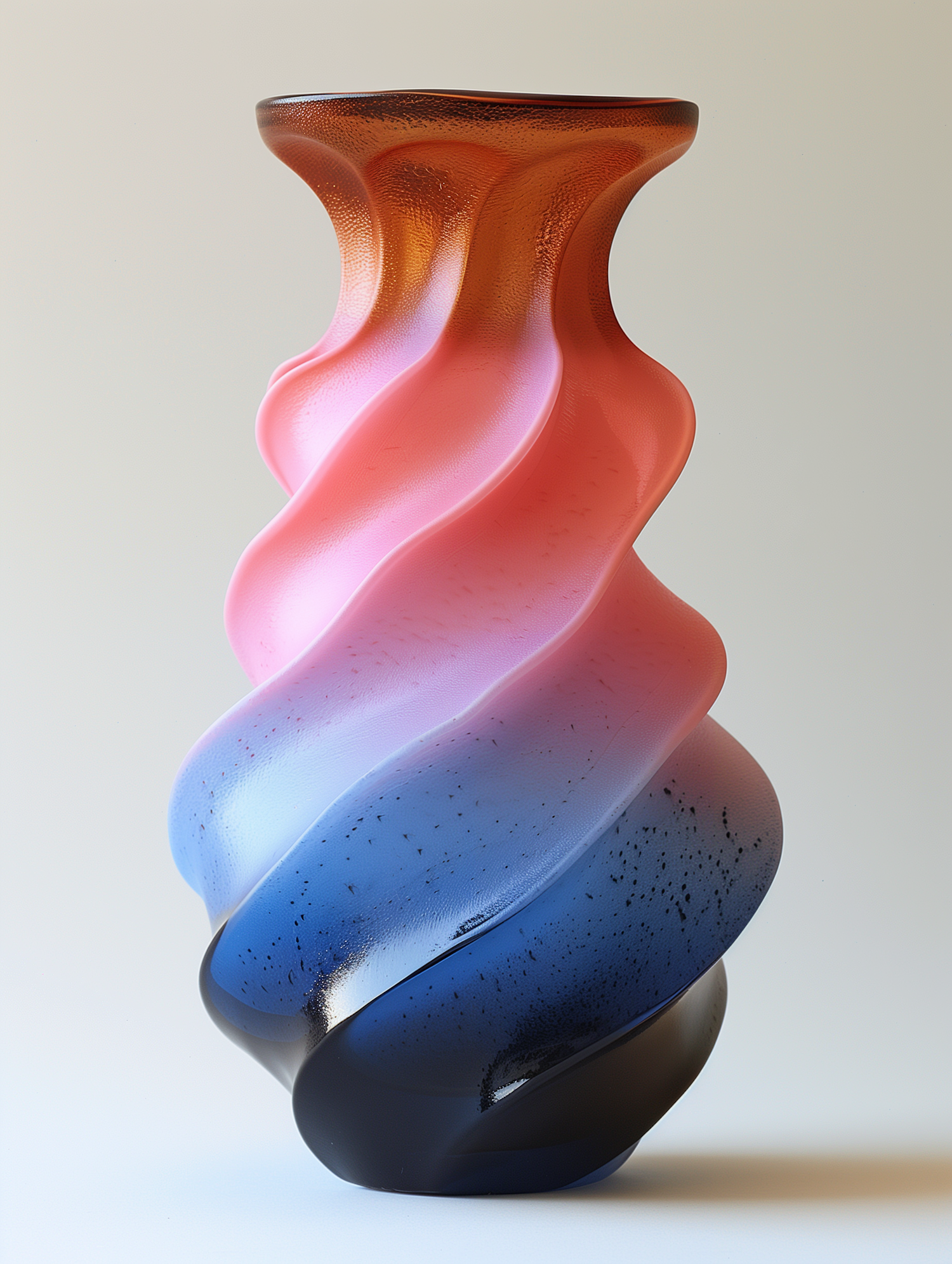 Elegant twisted glass vase with gradient colors from amber to pink to blue, showcasing a dynamic and artistic design.