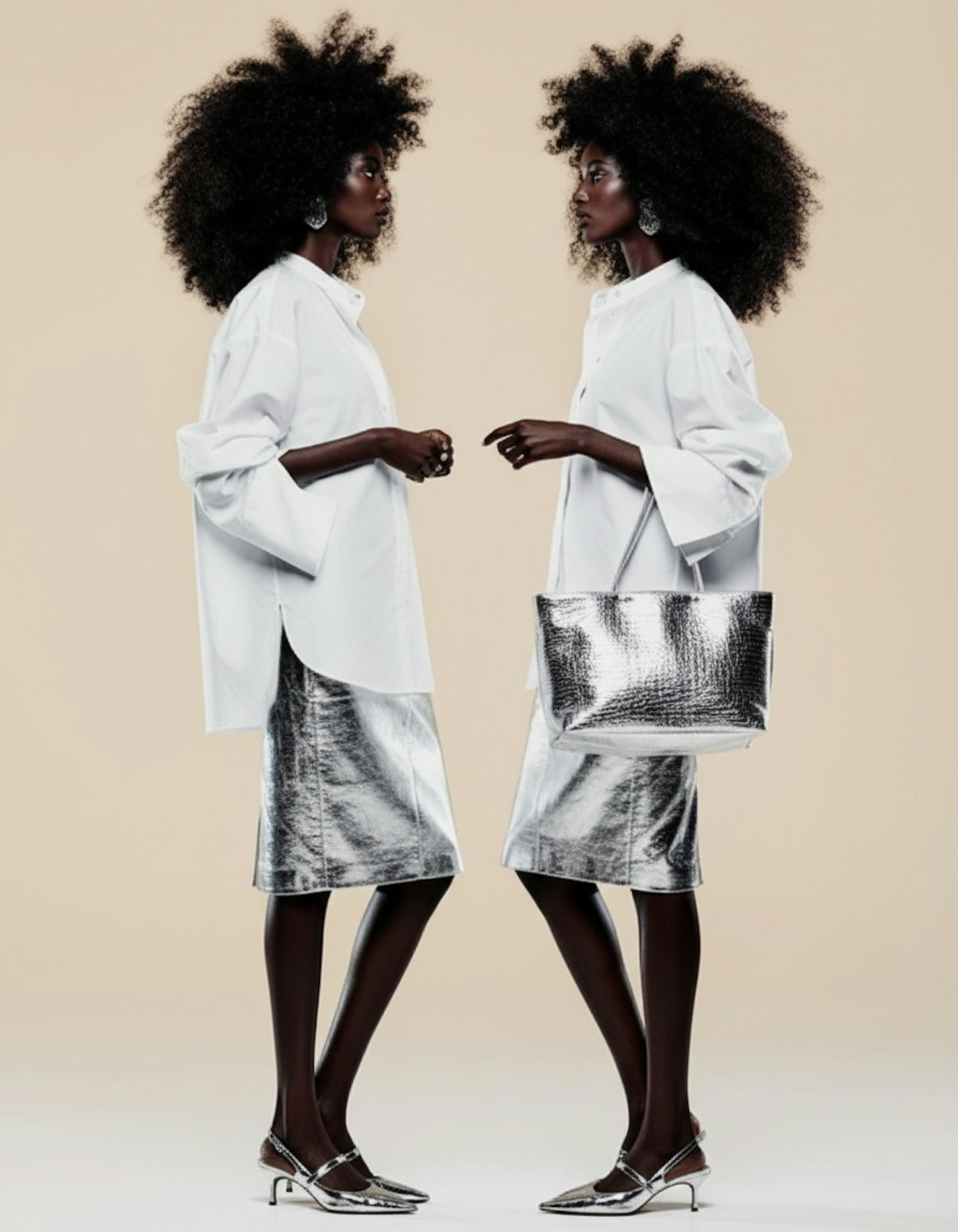 Two stylish individuals in white blouses and silver skirts pose symmetrically, showcasing modern fashion with a neutral background.