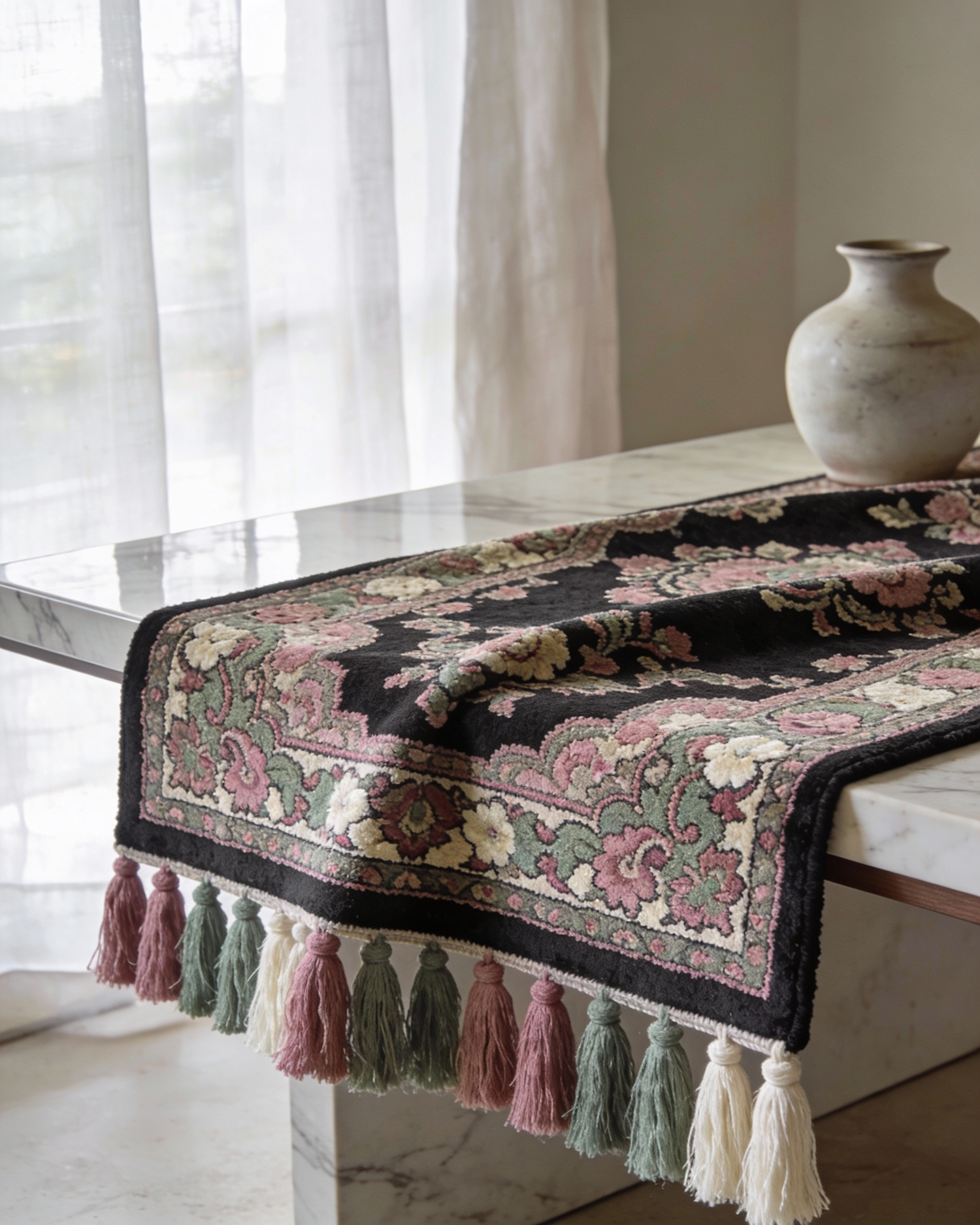 Elegant floral table runner with tassels on a marble table, paired with a rustic ceramic vase and soft natural light.