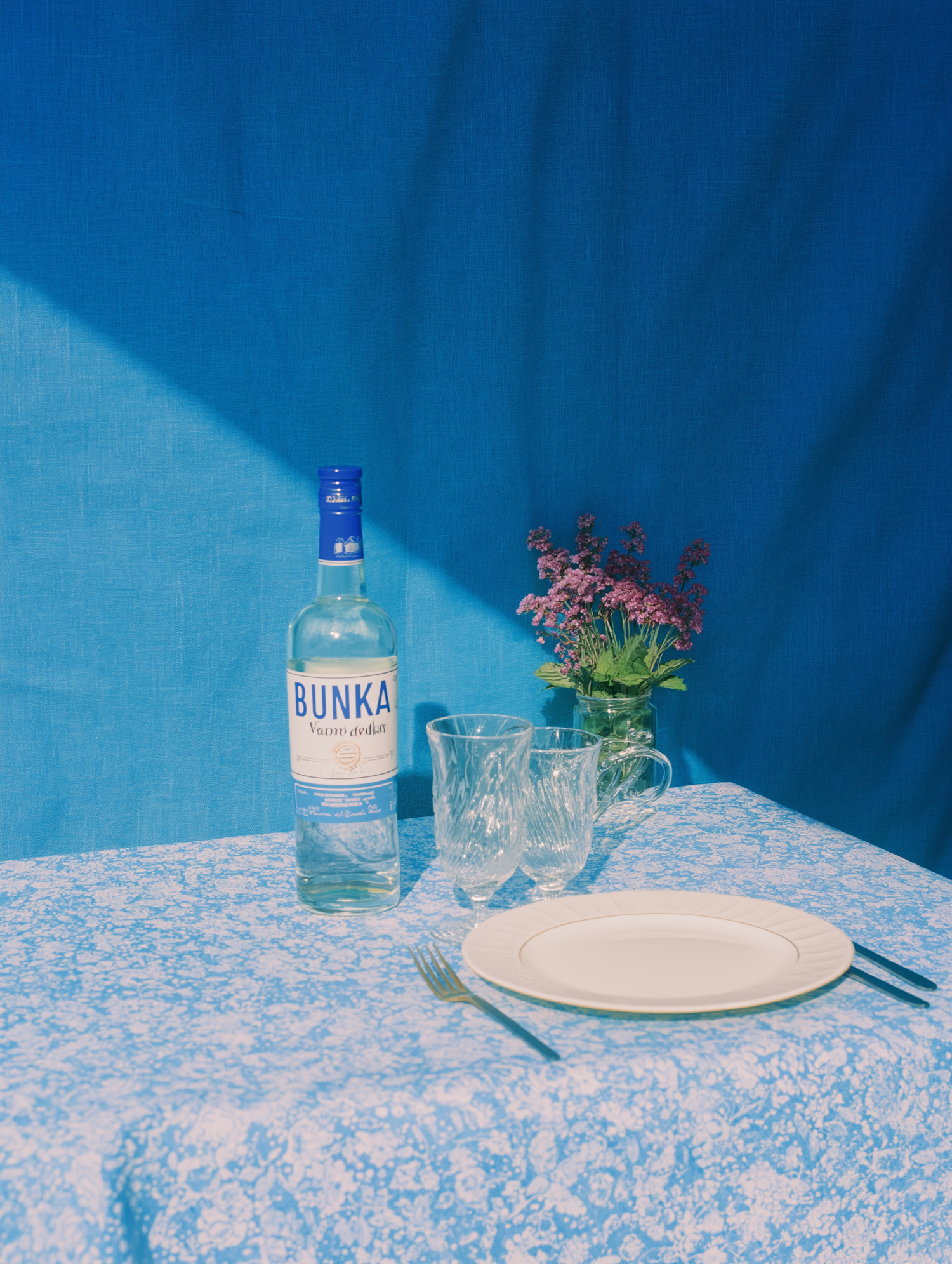 A stylish table setup with a blue theme, featuring a vodka bottle, glasses, a plate, and a vase with flowers on a patterned tablecloth.