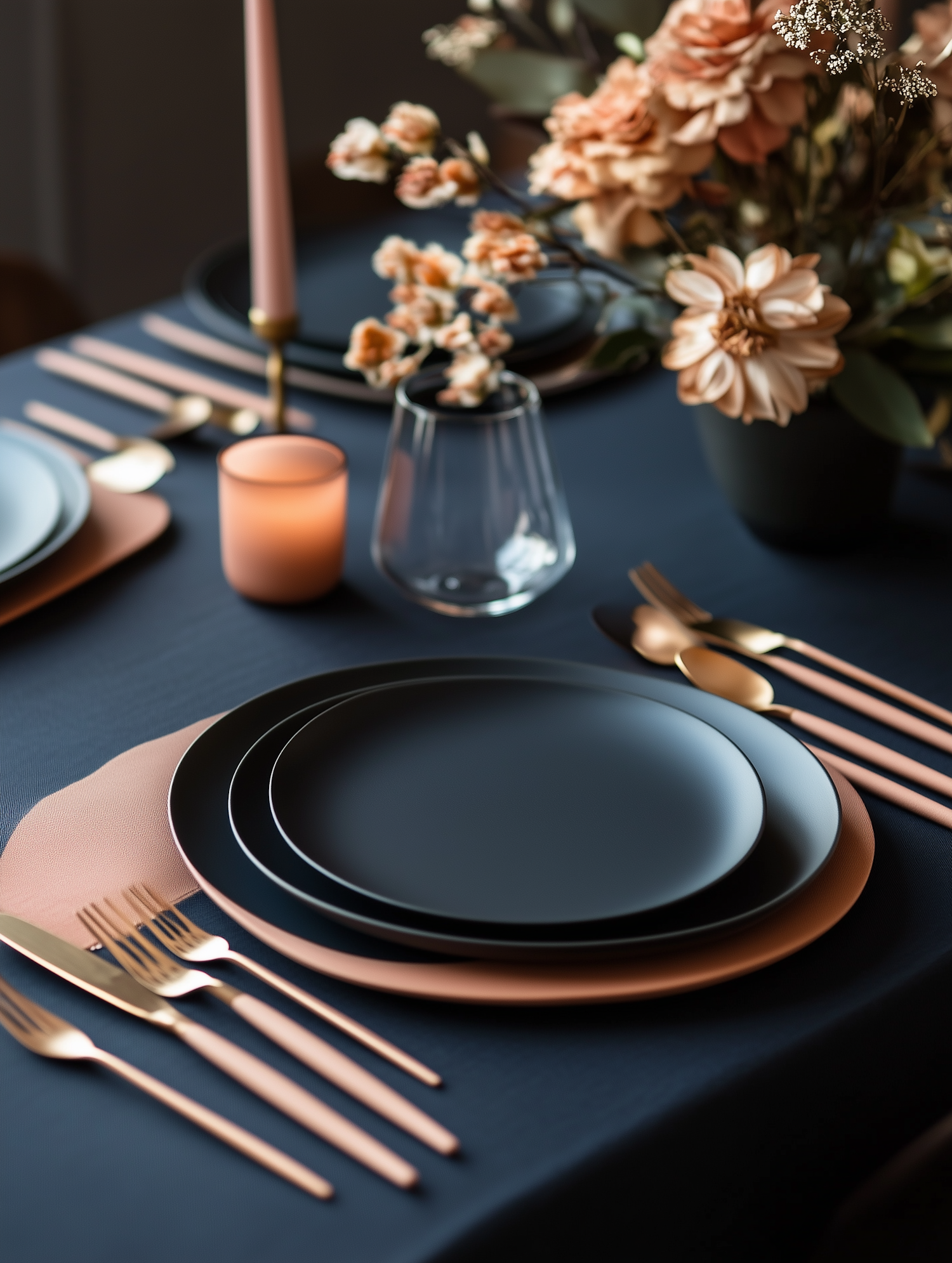 Elegant table setting with black plates, rose gold cutlery, peach accents, and a floral centerpiece on a navy tablecloth.
