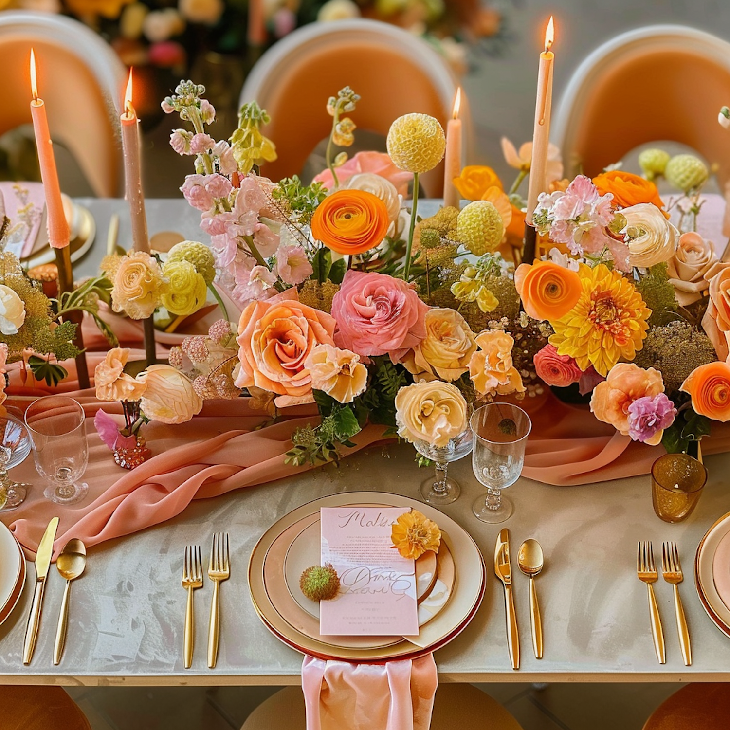 Elegant table setting with vibrant floral centerpiece, gold cutlery, and lit candles, creating a warm and inviting ambiance.