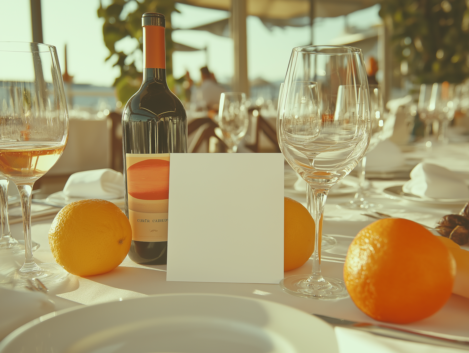 Elegant table setting with wine, glasses, and oranges in warm sunlight, creating a sophisticated dining ambiance.