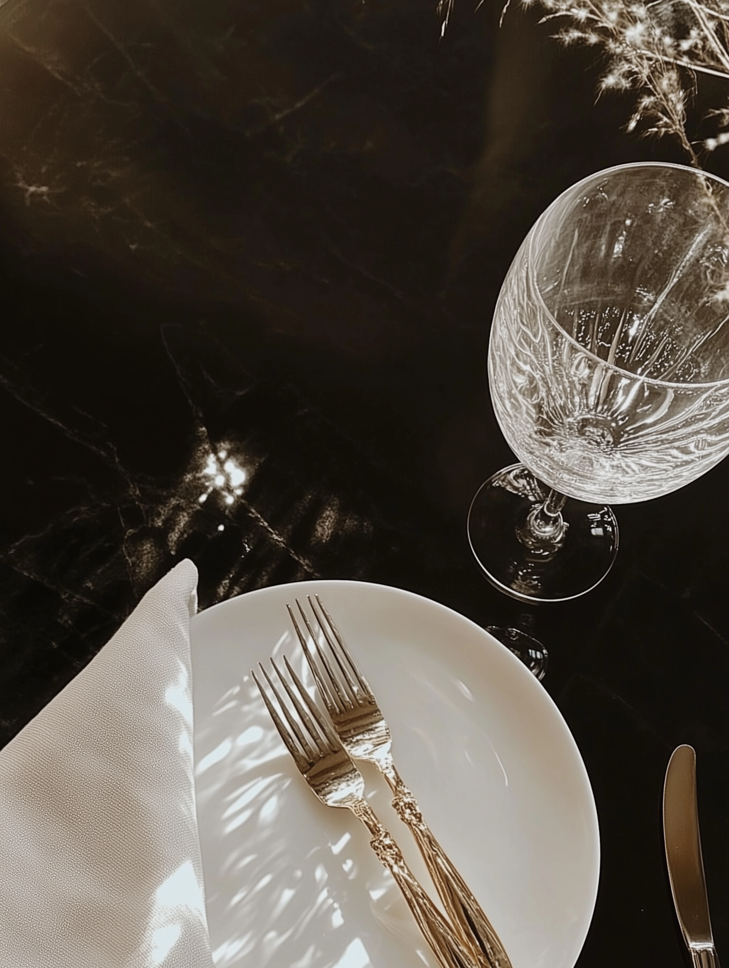Elegant table setting with white plate, ornate forks, and crystal wine glass on a dark surface, bathed in warm light.
