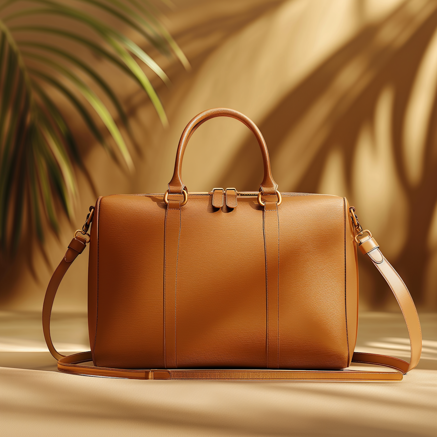 Elegant tan leather duffel bag with gold hardware, set against a warm, tropical background with palm leaf shadows.