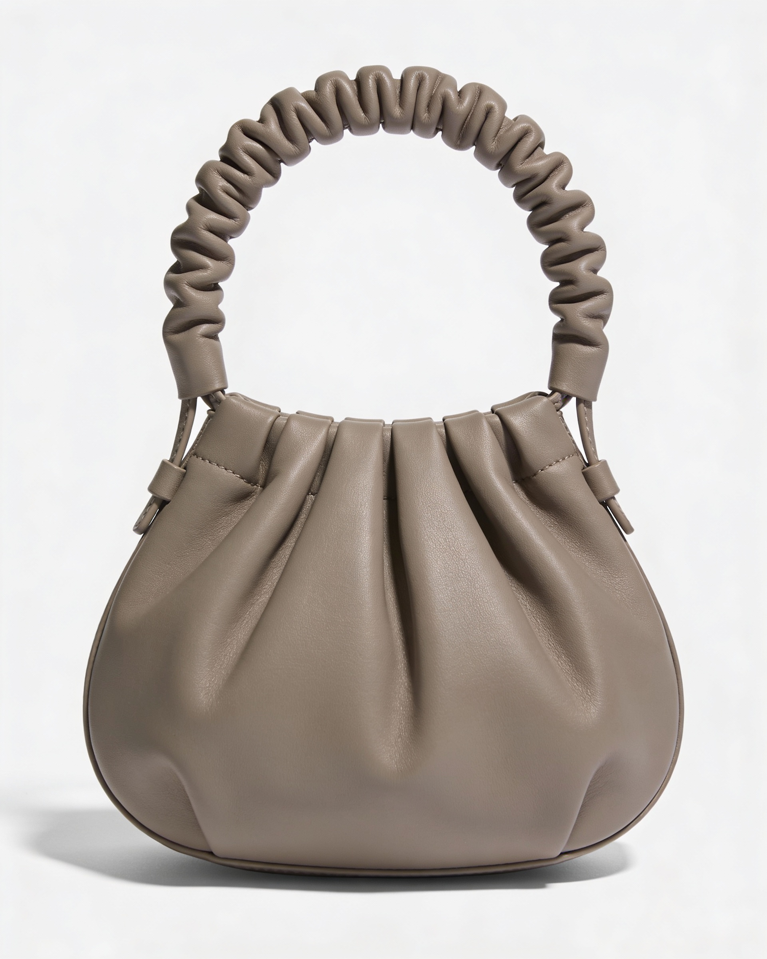 Elegant taupe leather handbag with a ruched handle and gathered body, perfect for a chic and versatile accessory.