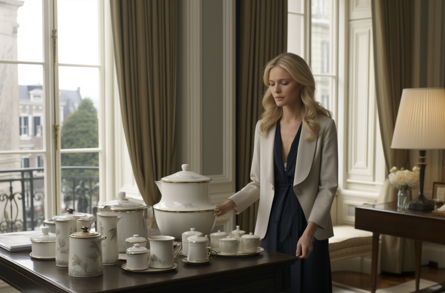 Elegant woman arranging fine porcelain tableware in a luxurious, well-lit room with large windows and beige curtains.