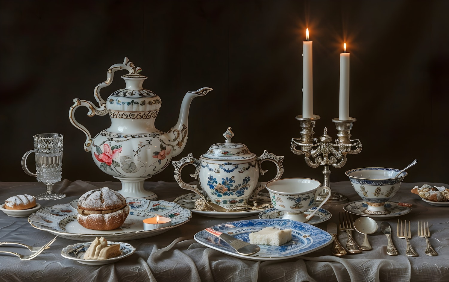 Elegant tea setting with ornate porcelain, silverware, and lit candles, creating a classic and sophisticated atmosphere.