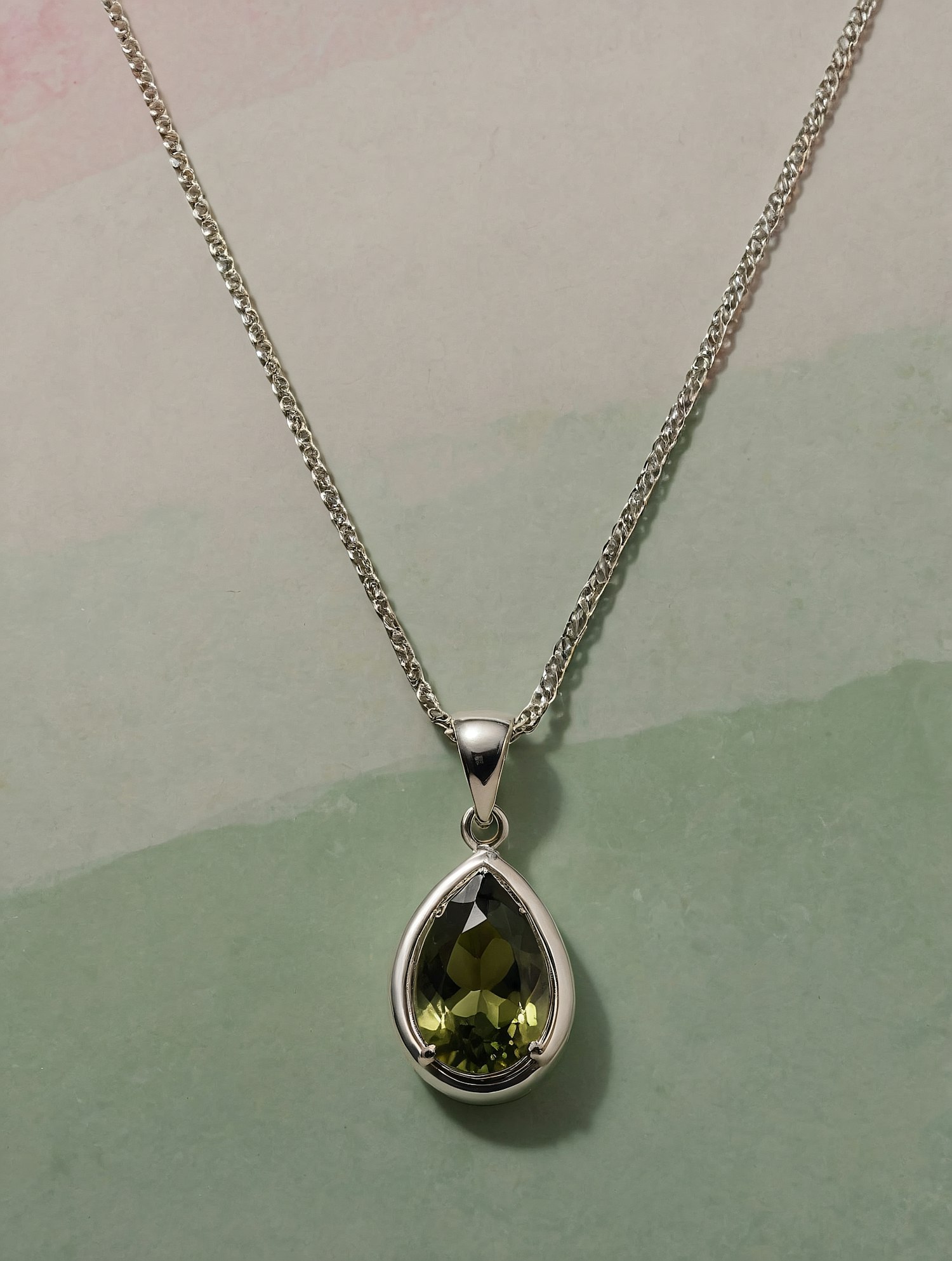 Elegant silver chain necklace with a teardrop green gemstone pendant on a pastel background.