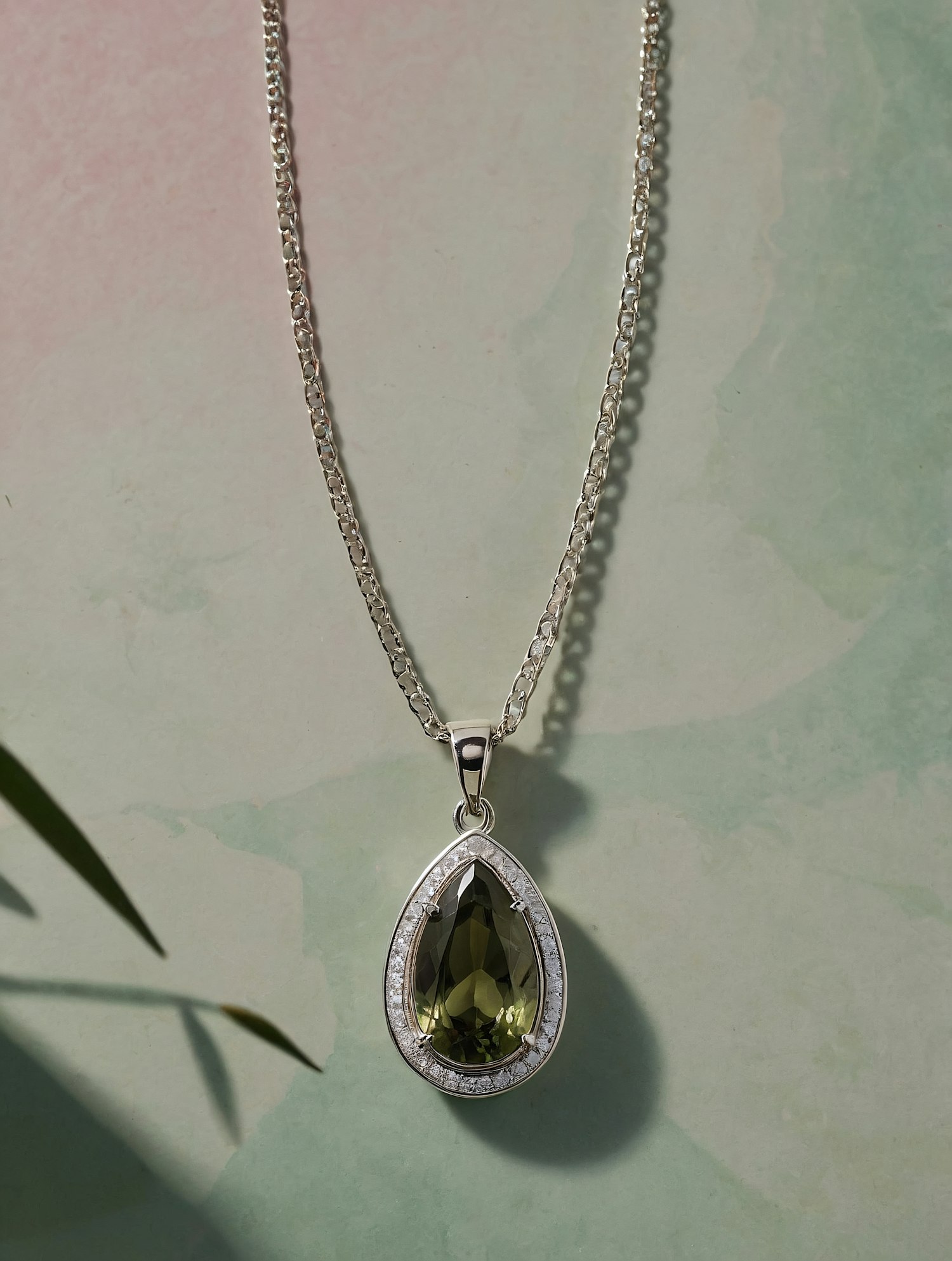 Elegant silver necklace with a teardrop green gemstone pendant on a pastel green background, accented by delicate shadows.