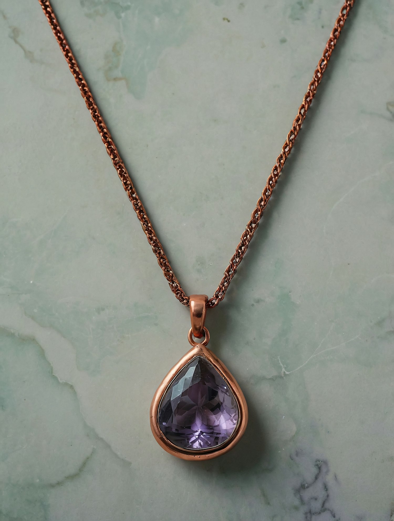 Elegant rose gold necklace with a teardrop-shaped purple gemstone pendant on a light green marble background.
