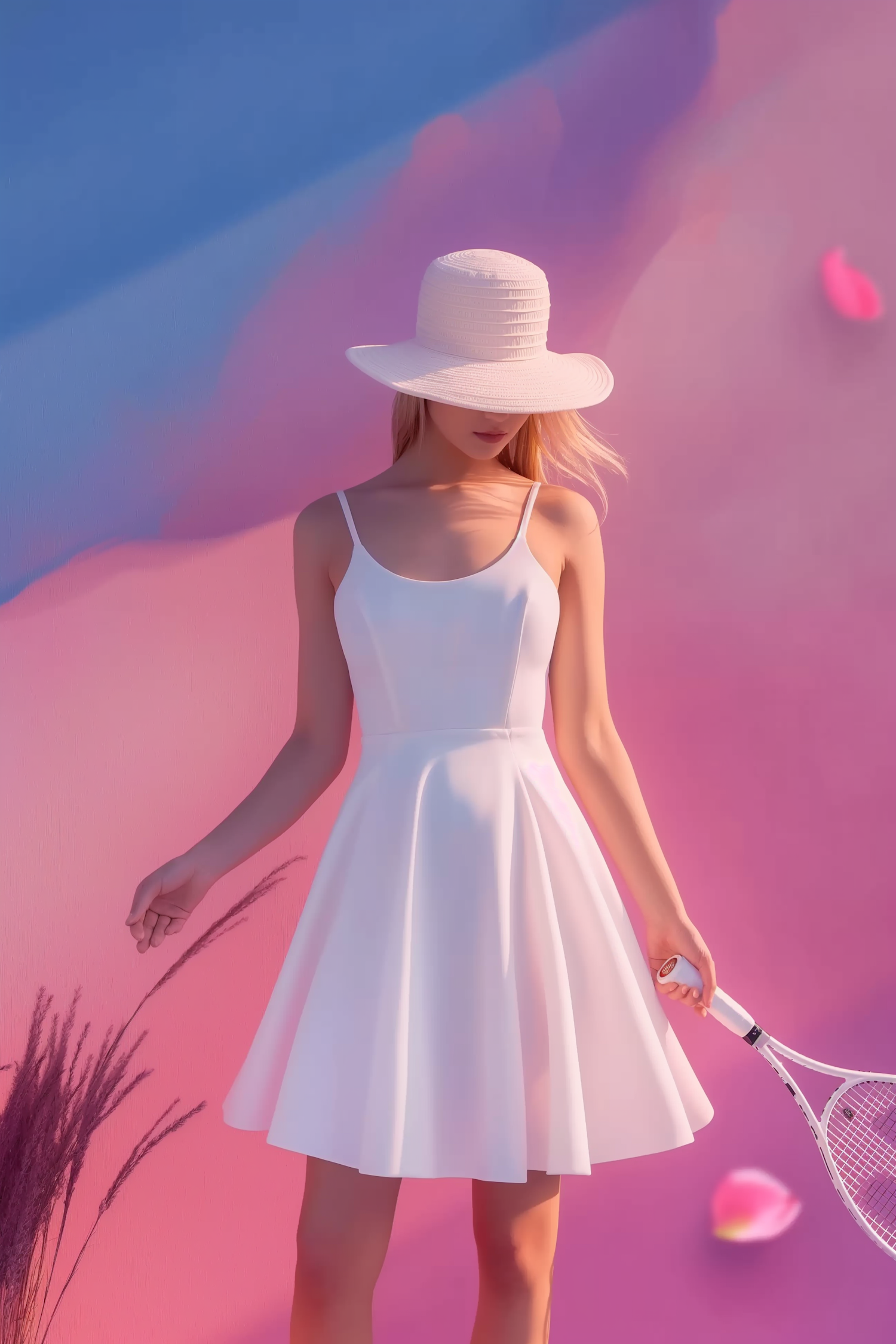 Elegant woman in white dress and hat holding a tennis racket against a dreamy pink and blue background.
