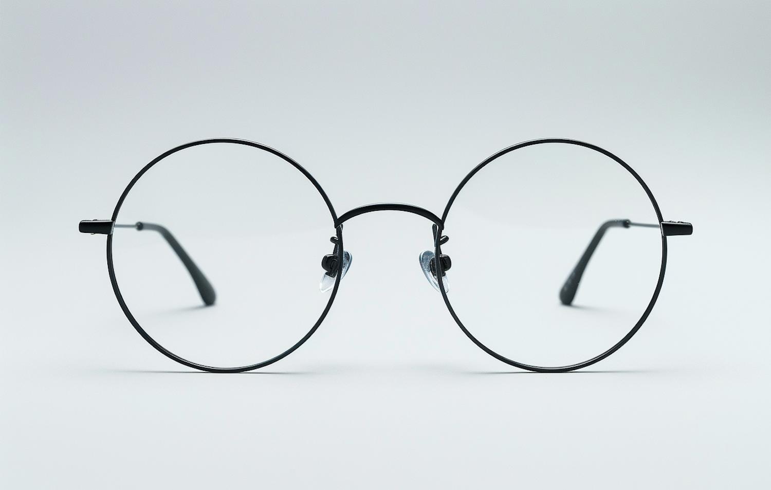Minimalist round eyeglasses with thin black frames on a white background, showcasing a classic and elegant design.