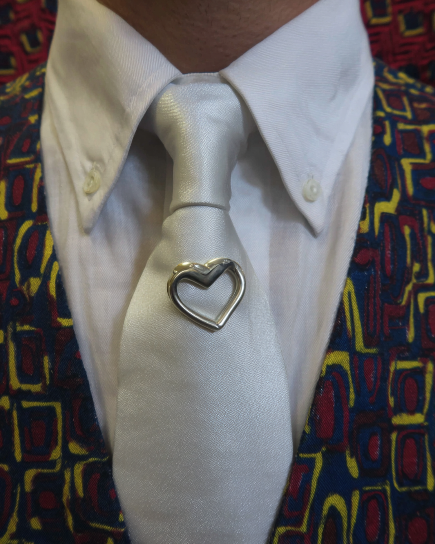 Close-up of a white tie with a silver heart pin, paired with a colorful geometric vest, showcasing a stylish and unique formal look.