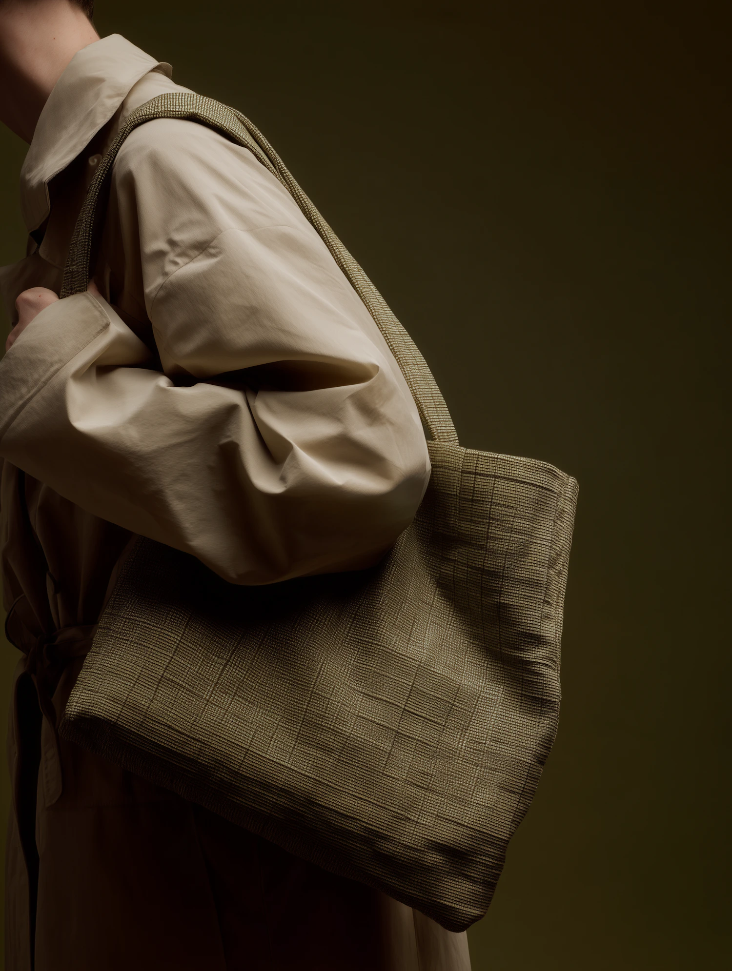 A stylish beige trench coat paired with a textured olive-green tote bag, set against a muted olive background.