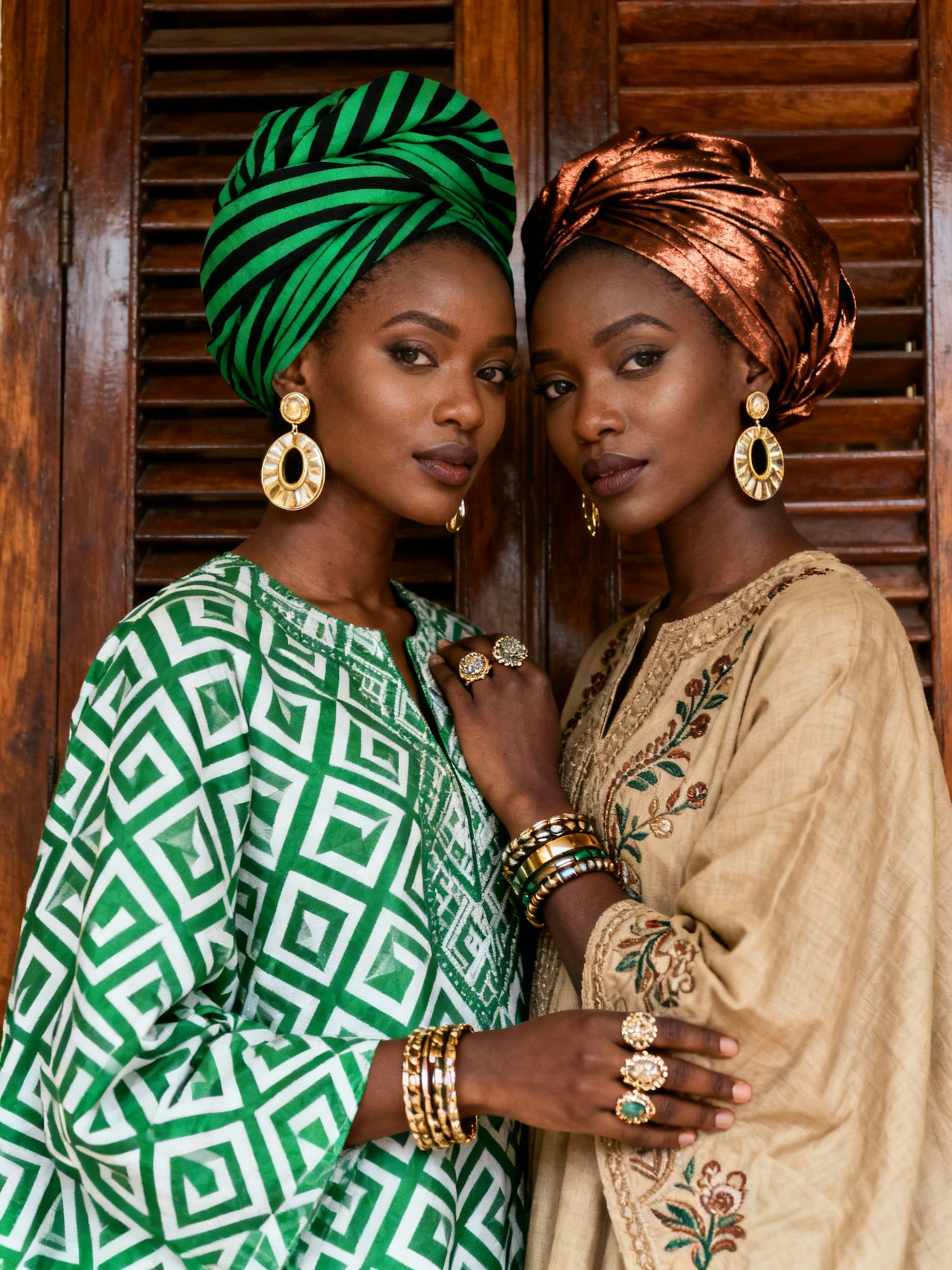 Waist-up, high-definition portrait of two Black women standing closely together in front of wooden shutters. One wears a green and white geometric outfit with a green-black striped headwrap; the other wears a beige embroidered garment with a copper-toned headwrap. Both are adorned with statement jewelry—earrings, bracelets, and rings. Their expressions are calm and confident, evoking intimacy and cultural pride. Lighting is soft and directional, highlighting the textures of their garments and the warmth of the wood. The mood is elegant, grounded, and editorial—ideal for an Afro-fusion fashion portrait or identity showcase.