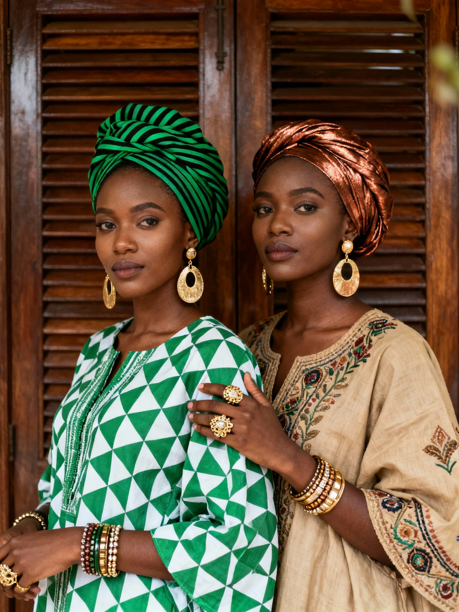 Waist-up, high-definition portrait of two Black women standing closely together in front of wooden shutters. One wears a green and white geometric outfit with a green-black striped headwrap; the other wears a beige embroidered garment with a copper-toned headwrap. Both are adorned with statement jewelry—earrings, bracelets, and rings. Their expressions are calm and confident, evoking intimacy and cultural pride. Lighting is soft and directional, highlighting the textures of their garments and the warmth of the wood. The mood is elegant, grounded, and editorial—ideal for an Afro-fusion fashion portrait or identity showcase.