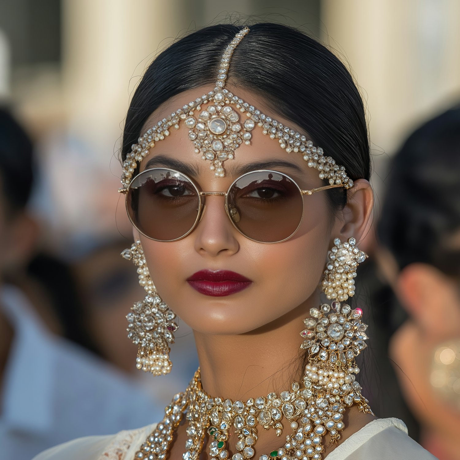 A woman wearing traditional jewelry, round sunglasses, and bold red lipstick, exuding elegance and style in a blurred outdoor setting.