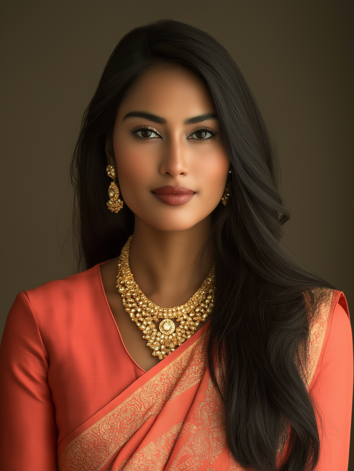 Elegant woman in orange sari with gold jewelry, long black hair, and serene expression against a muted brown background.