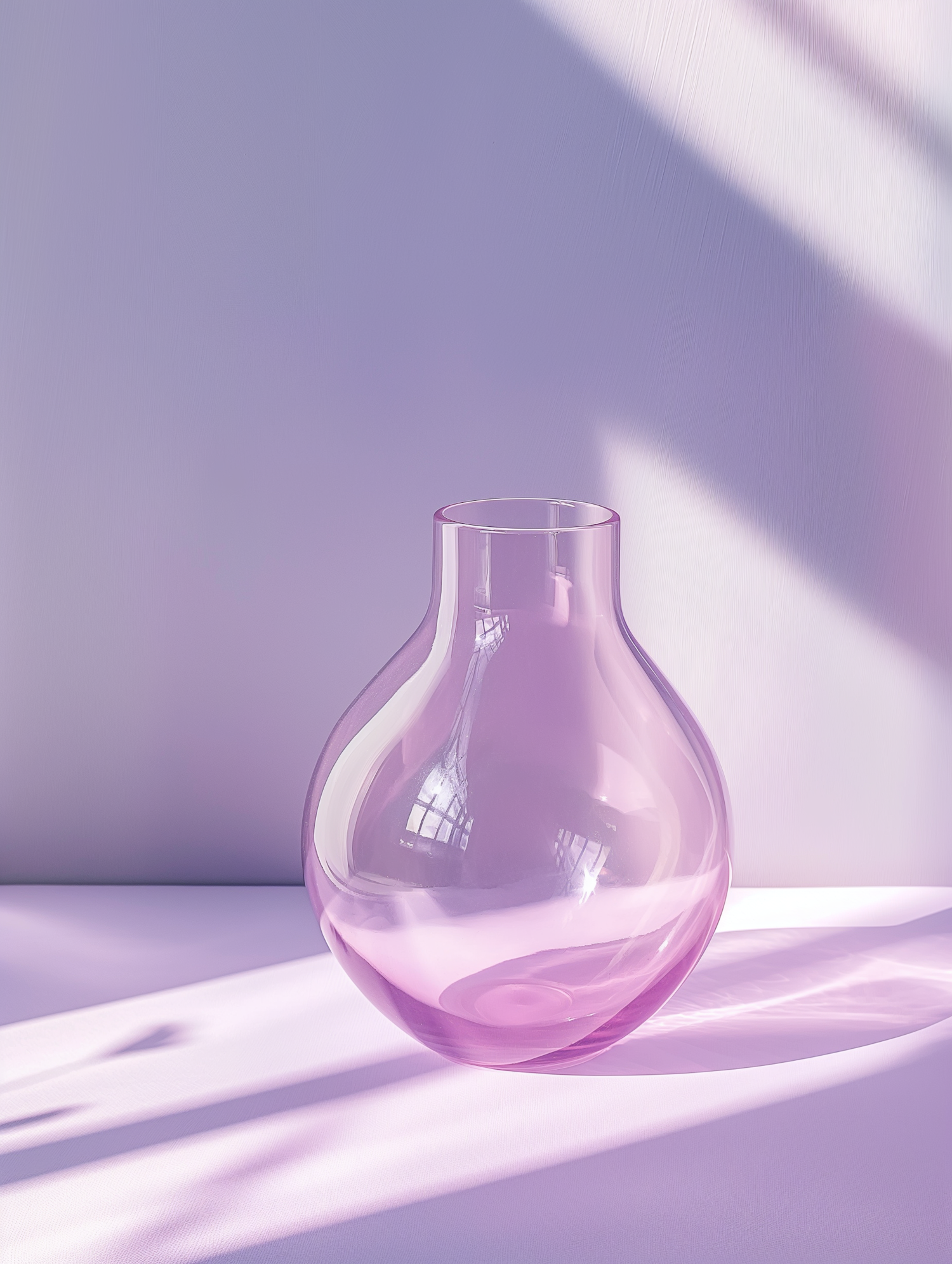 Elegant pink glass vase on a light purple surface with soft sunlight and shadows, creating a serene and artistic atmosphere.