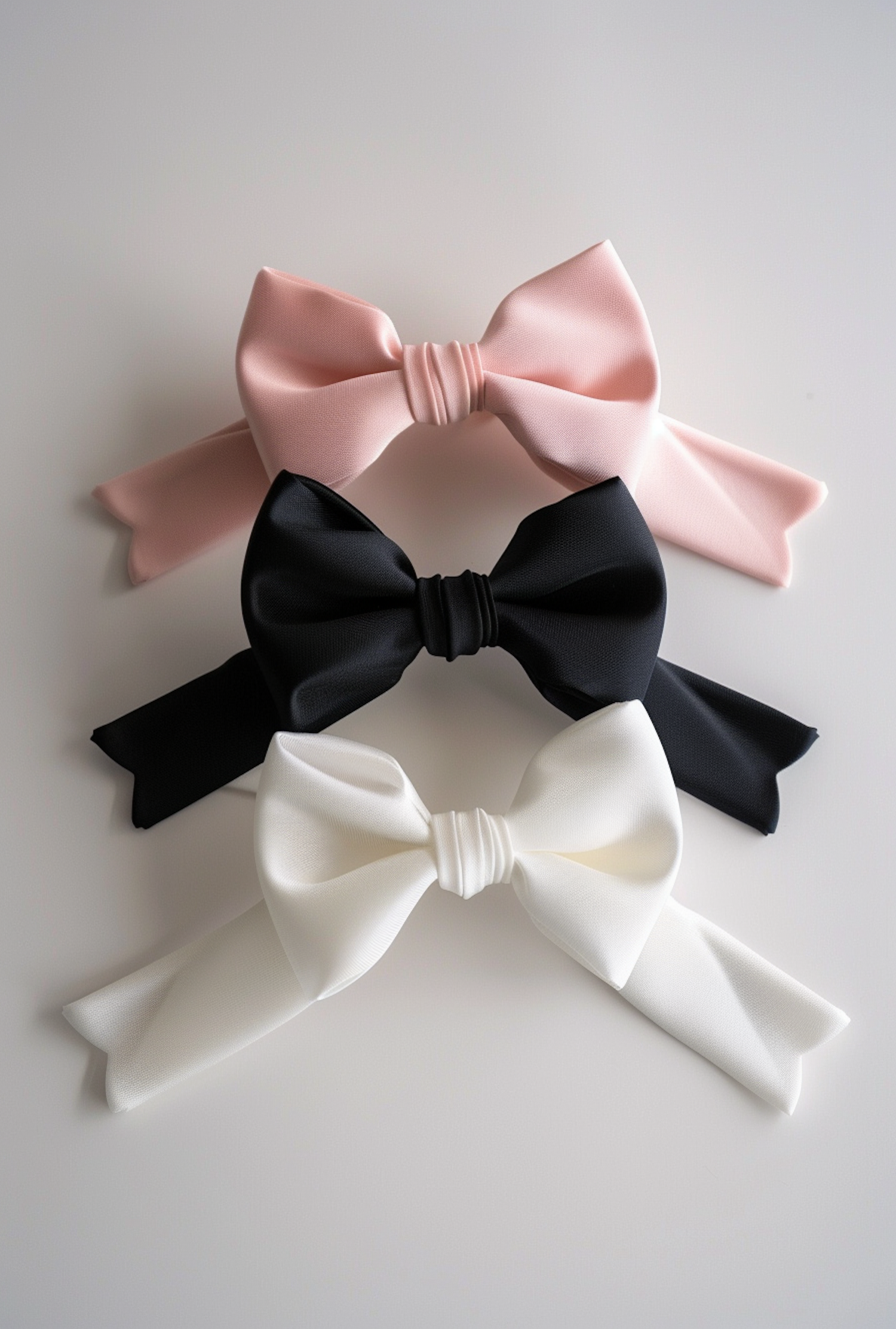 Elegant pink, black, and white bows arranged vertically on a light surface, showcasing contrast and sophistication.