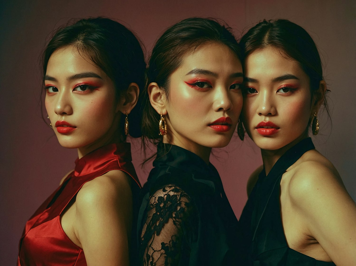 Three women with bold red makeup and elegant dresses pose confidently, showcasing striking fashion and beauty.