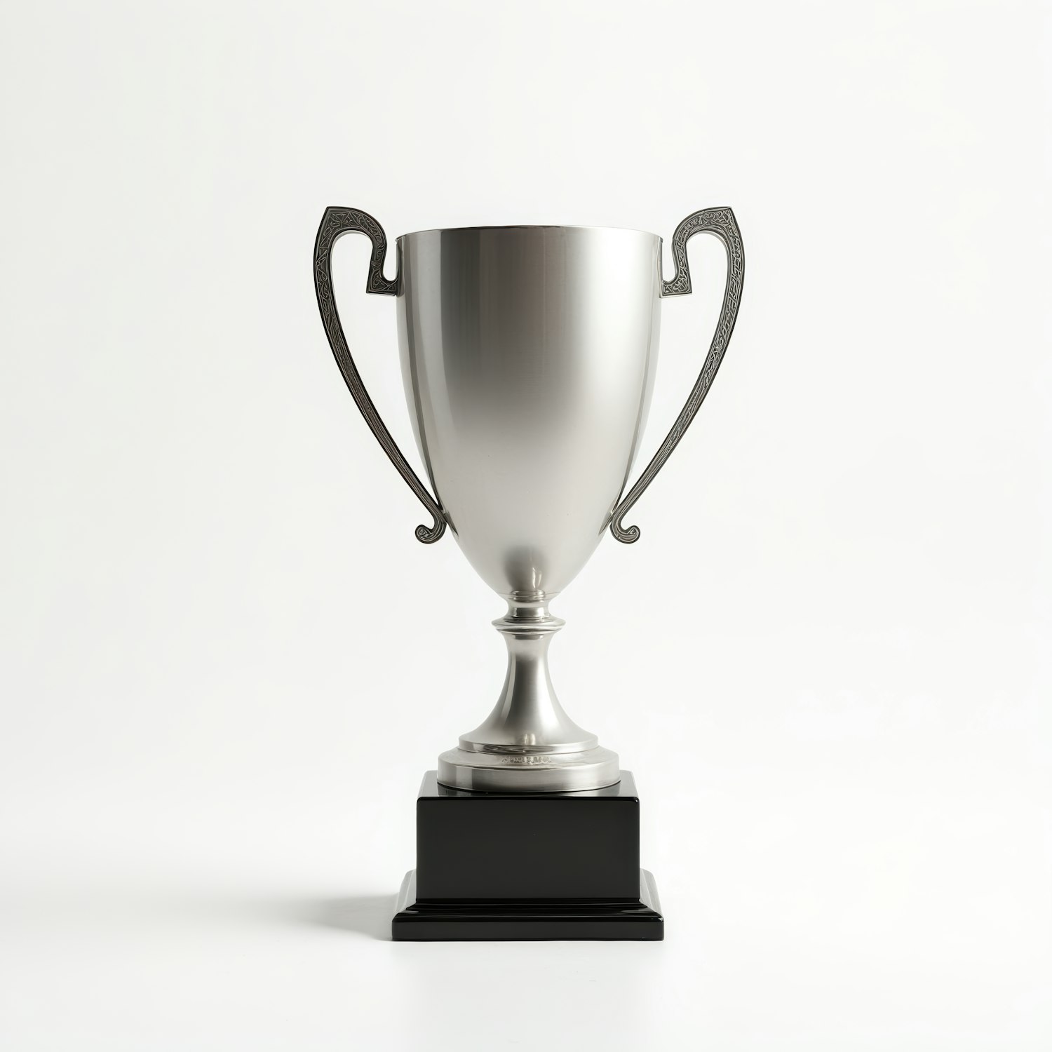 Elegant silver trophy with curved handles on a black base, symbolizing achievement and success.