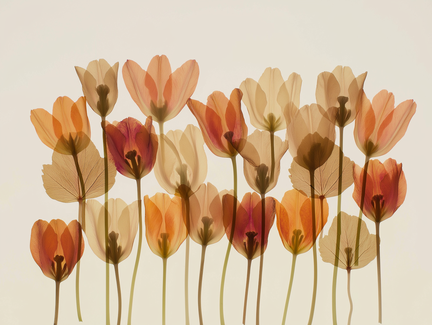 A beautiful arrangement of translucent white and orange tulips in warm tones, showcasing their delicate textures and overlapping petals on a soft background.