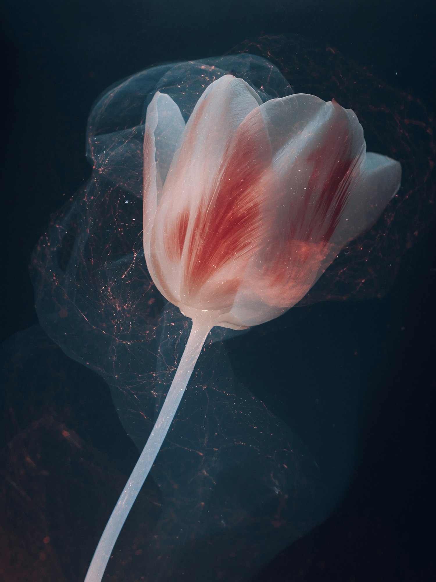 A close-up of a tulip with white and red petals, surrounded by a misty, ethereal glow against a dark background.