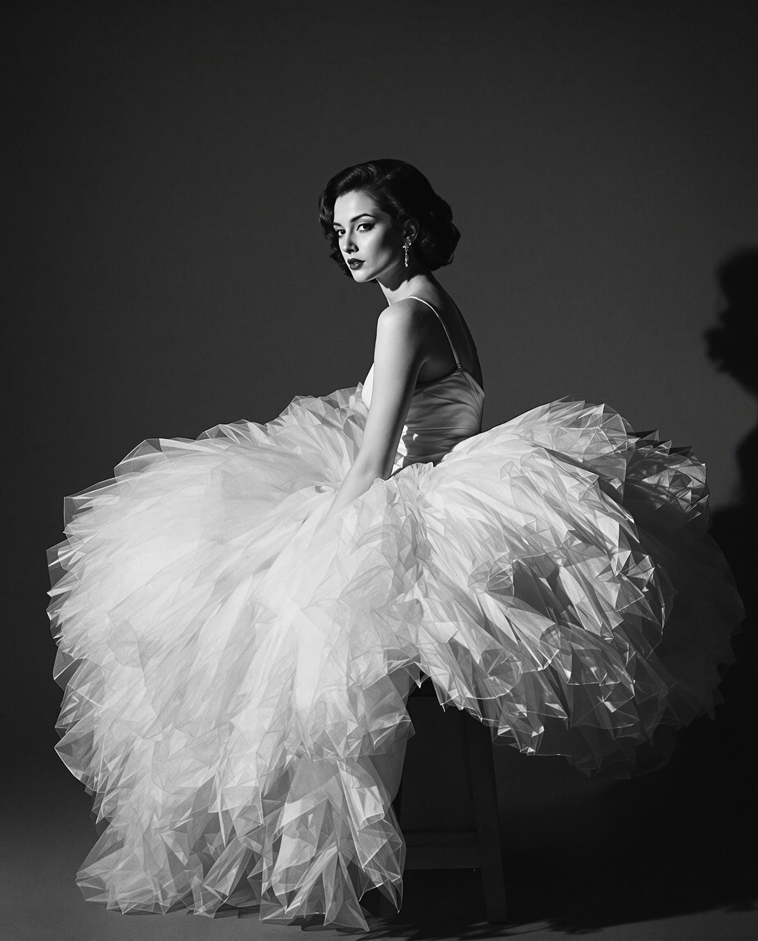 Black and white editorial portrait of a woman in a voluminous vintage dress, sitting sideways on a wooden stool. Dramatic directional lighting from a high angle creates rich shadows and textures. Grainy film look adds timeless elegance. Composition inspired by classic fashion photography from the '60s.