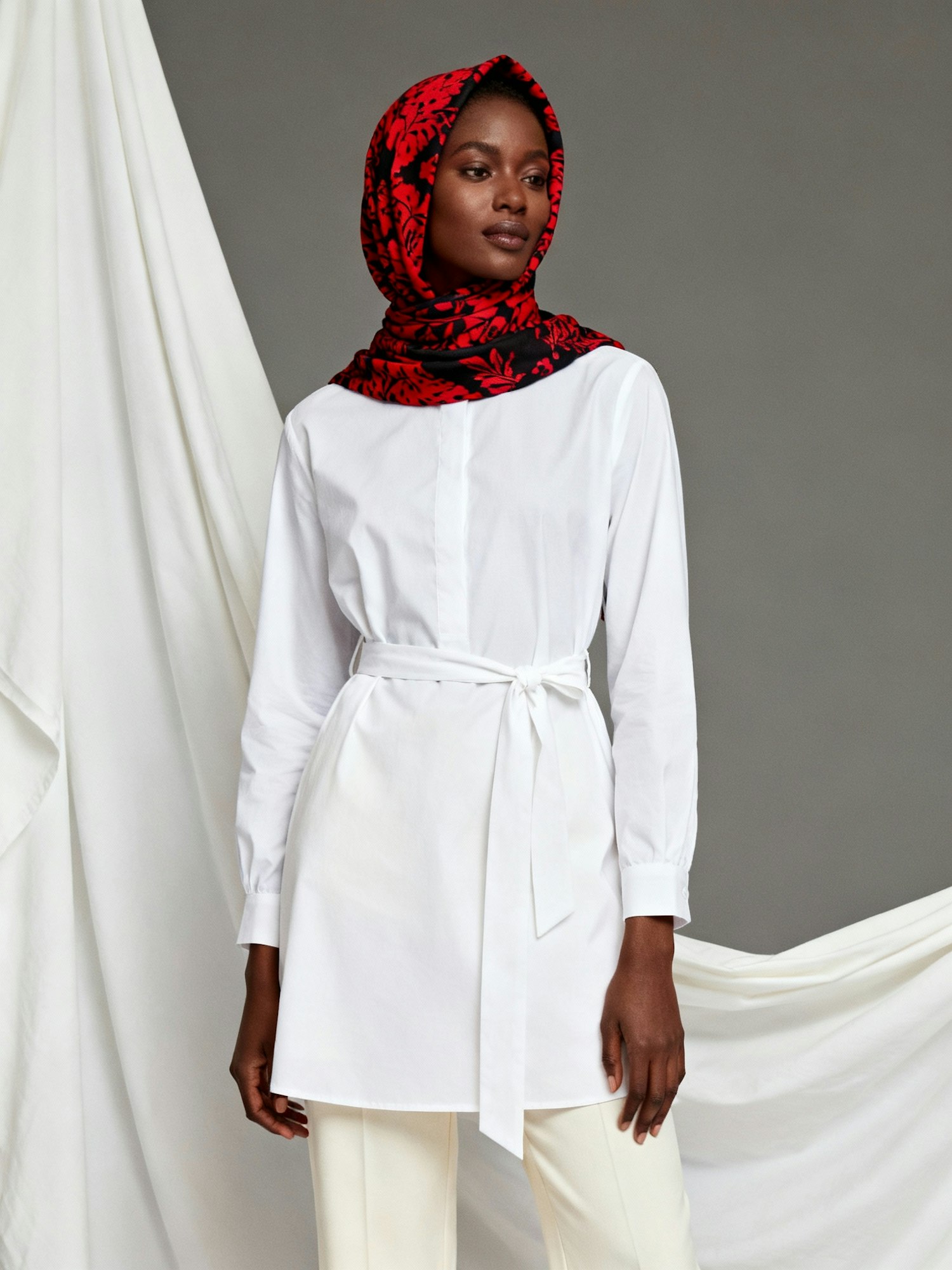 A woman in a white tunic and trousers with a red and black headscarf stands against a neutral background with draped white fabric.
