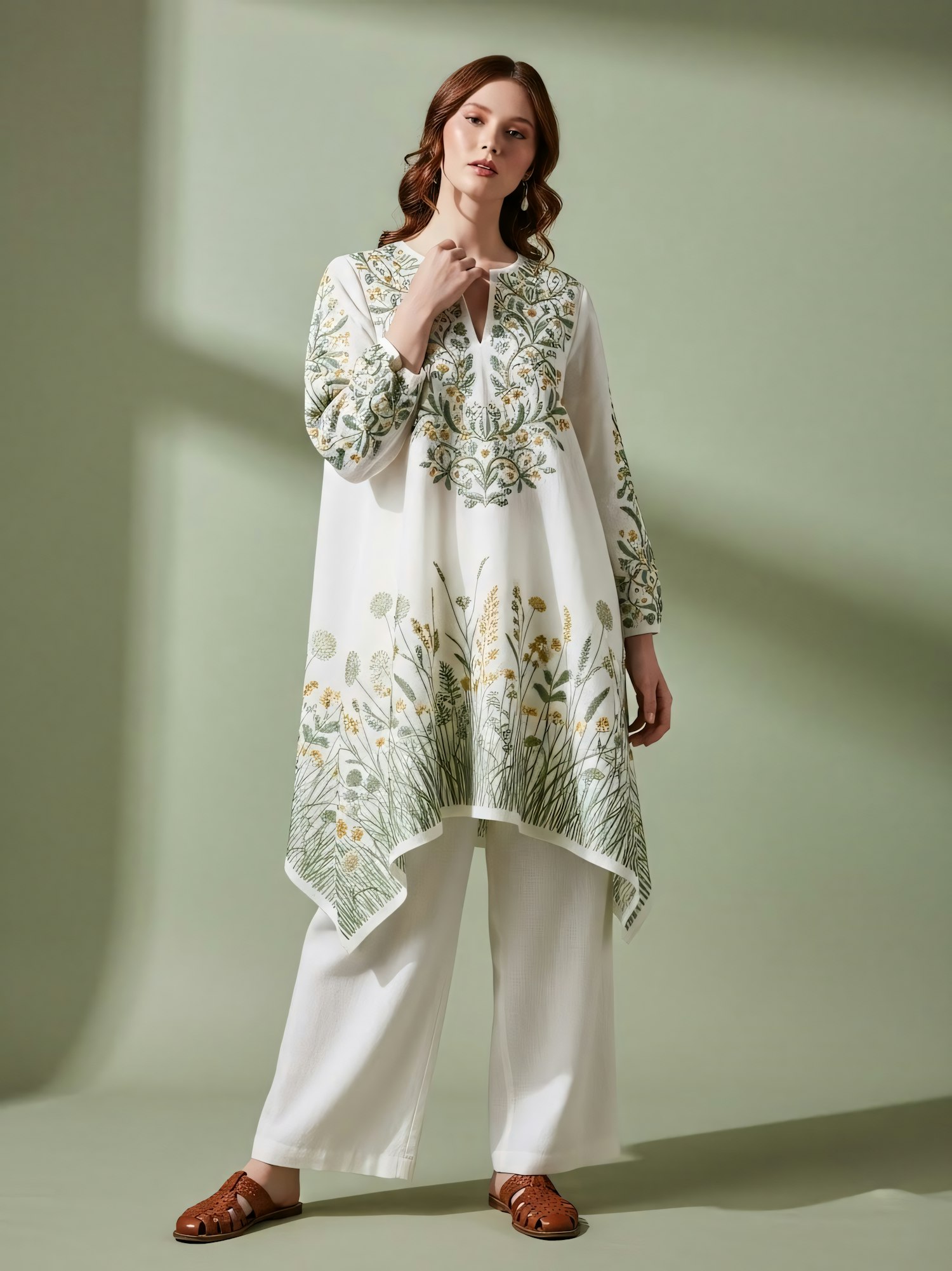 A woman in a white floral embroidered tunic and trousers poses against a green background, showcasing a serene and elegant style.